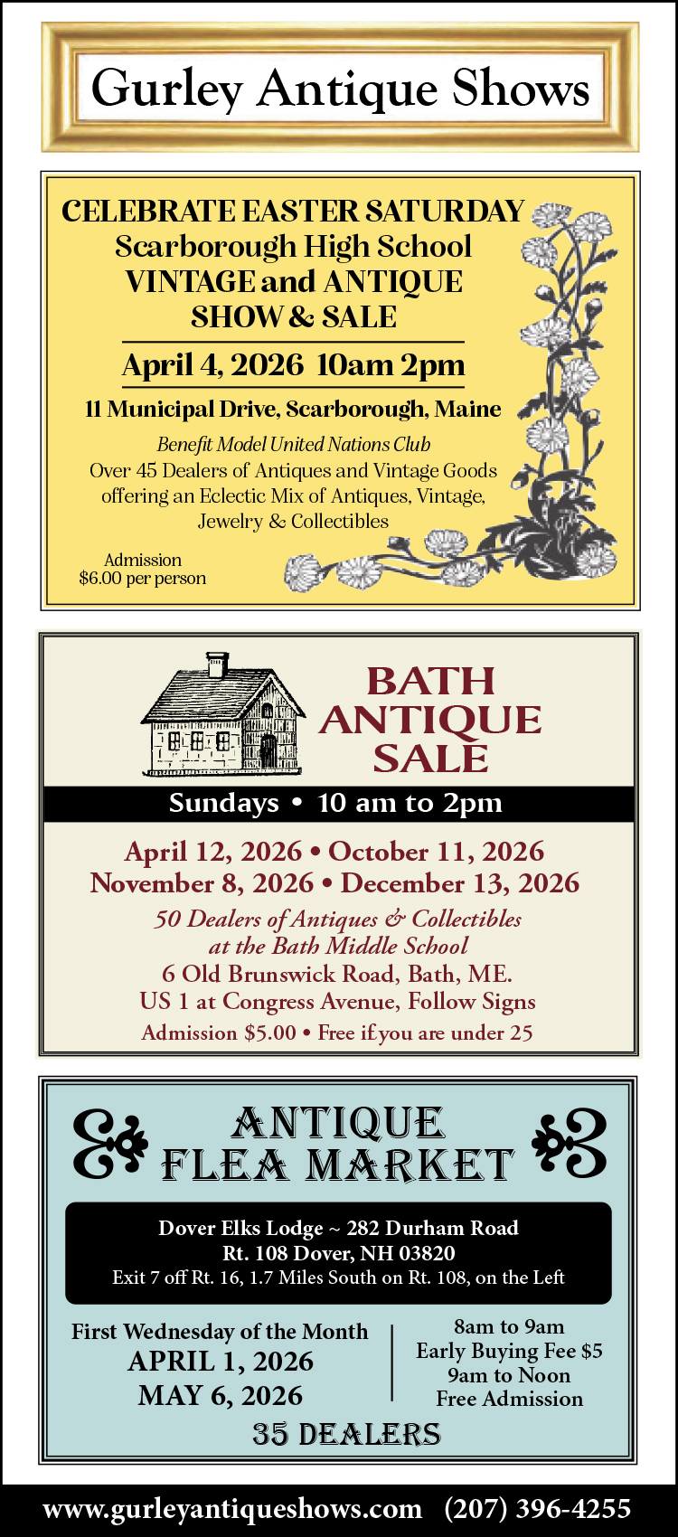 Gurley - Bath Antique Sale Sundays • 10 am to 2pm April 12, 2026 6 Old Brunswick Road, Bath, ME. gurley_antique_shows October 11, 2026 November 8, 2026 • December 13, […]