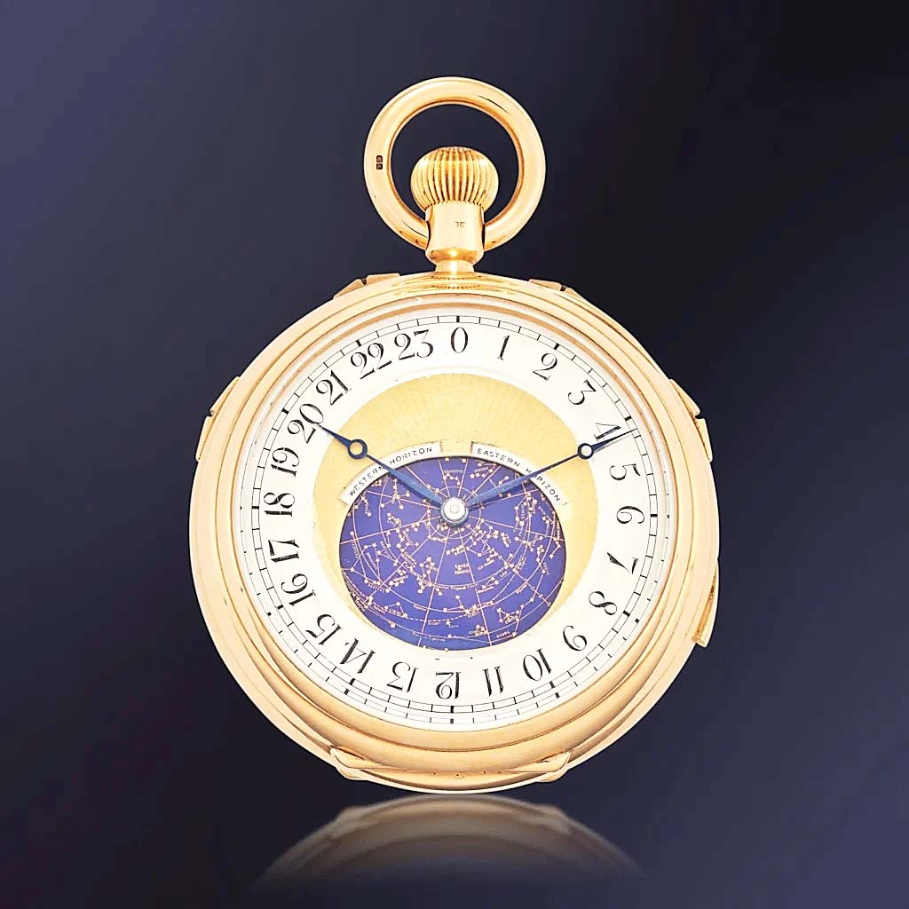 Why: After a 104-year search, “the most complicated Audemars Piguet pocket watch in private hands” resurfaced at auction, only to be purchased as a historic artifact by the very company that made it. Created for S. Smith & Sons of London in 1921 after seven years of development, the “astronomical pocket watch features 19 complications — including a celestial chart for the night sky over London, perpetual calendar, minute repeater with grande and petite sonnerie, one-minute tourbillon, equation of time, power reserve and sidereal time,” noted Sotheby’s Karyn Orrico. Cased in 18K yellow gold, it is the only AP pocket watch of its era to feature a sky chart.