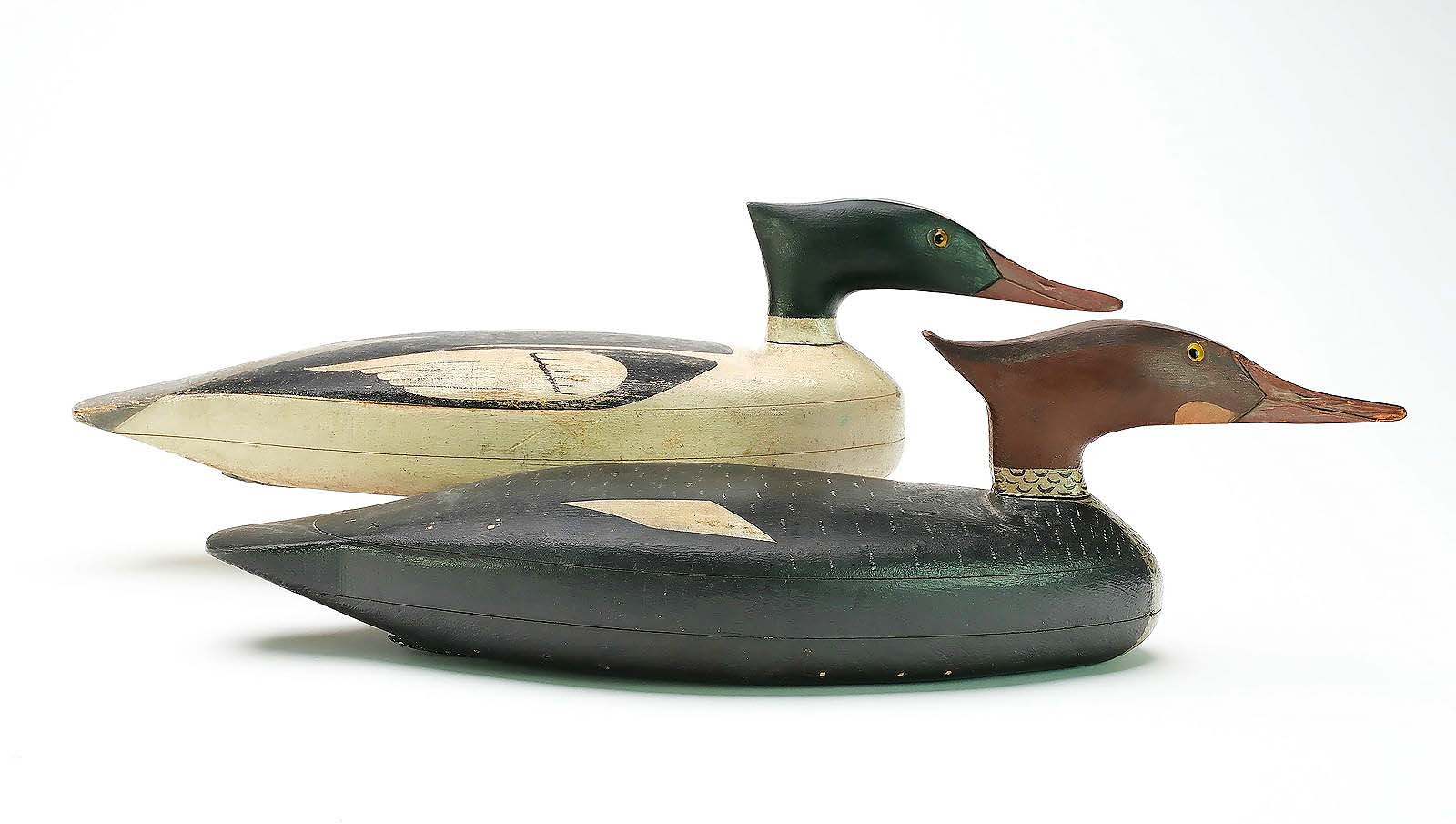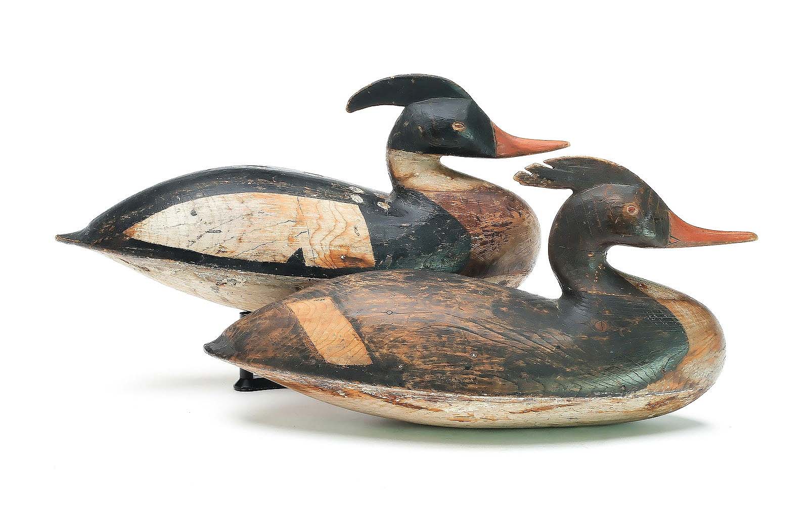 Although these 14¼-inch-long Cape May County, N.J., hollow-carved mergansers did not have a known maker, they were dated to the late Nineteenth Century and had extended provenance; they were bid to $198,000 ($80/120,000).