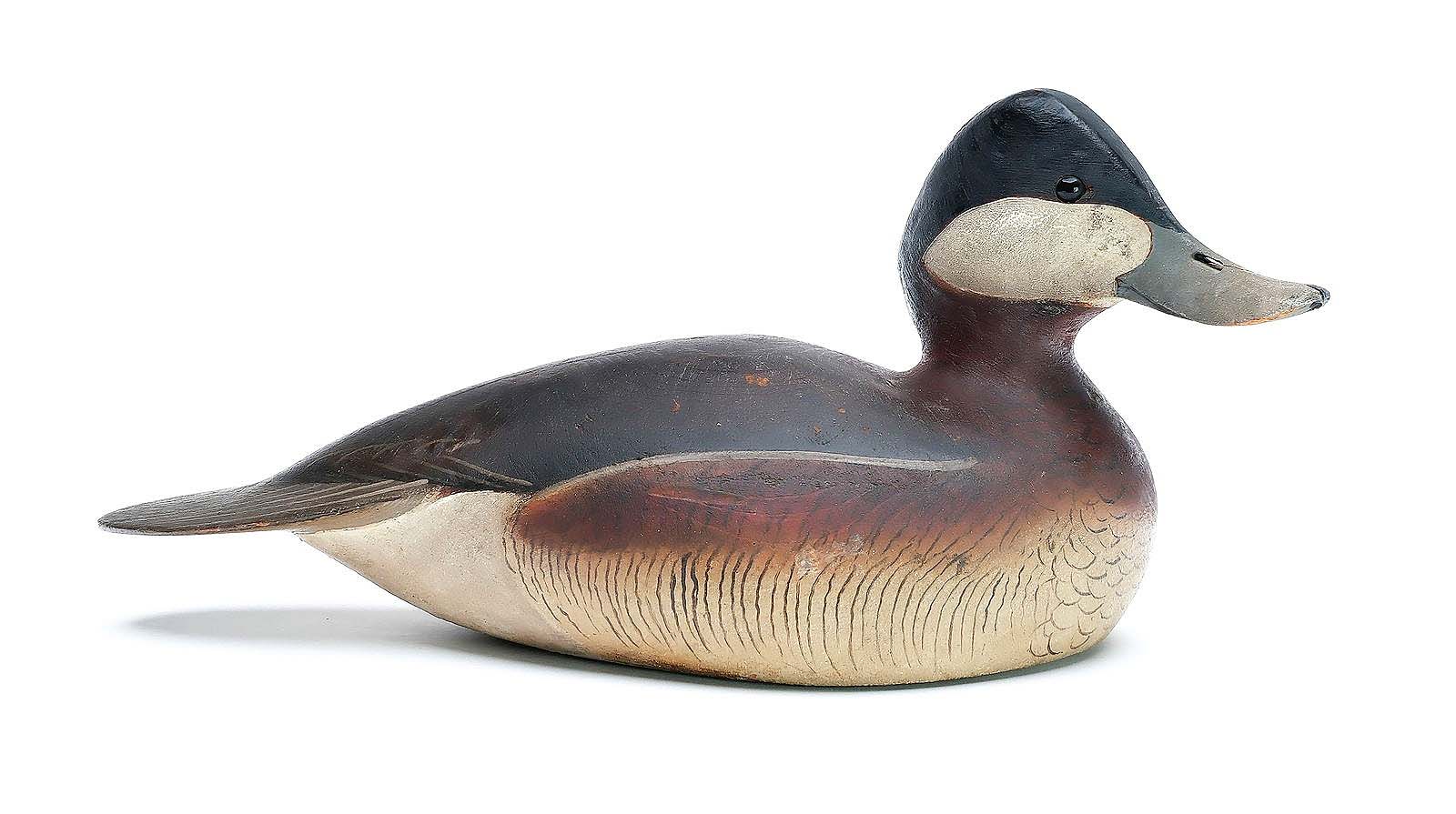 Made by the Ward Brothers circa 1940, this 14-inch-long cedar body ruddy duck in the 1936 gunning style is possibly the only known example. Its rarity may have helped drive its price past its $60/80,000 estimate to reach $192,000.