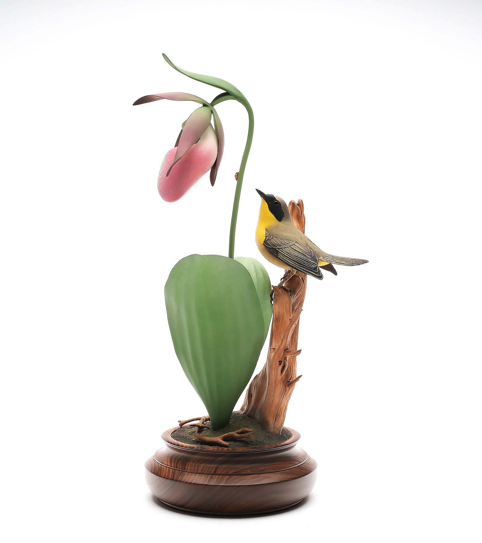 Lawson’s sculptural common yellowthroat paired with a lady’s slipper flower bloomed to $12,000, tripling its $3/4,000 estimate. The 4-inch-long bird was placed on a natural wood perch, looking at a ladybug on the stem of the flower. A pair of decorative quail with relief wing and tail feather carving, both dated 1969, also found a new home at $5,700.