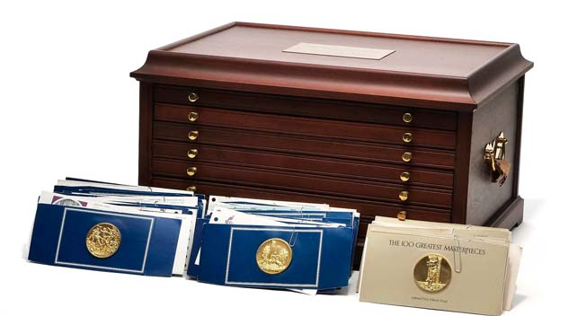 Achieving the sale-high price of $11,590 was “The 100 Greatest Masterpieces” from the Franklin Mint, first edition proof set of gold vermeil on sterling silver coins, number 6251, approximately 208 troy ounces, housed in a fancy presentation box ($6/8,000).