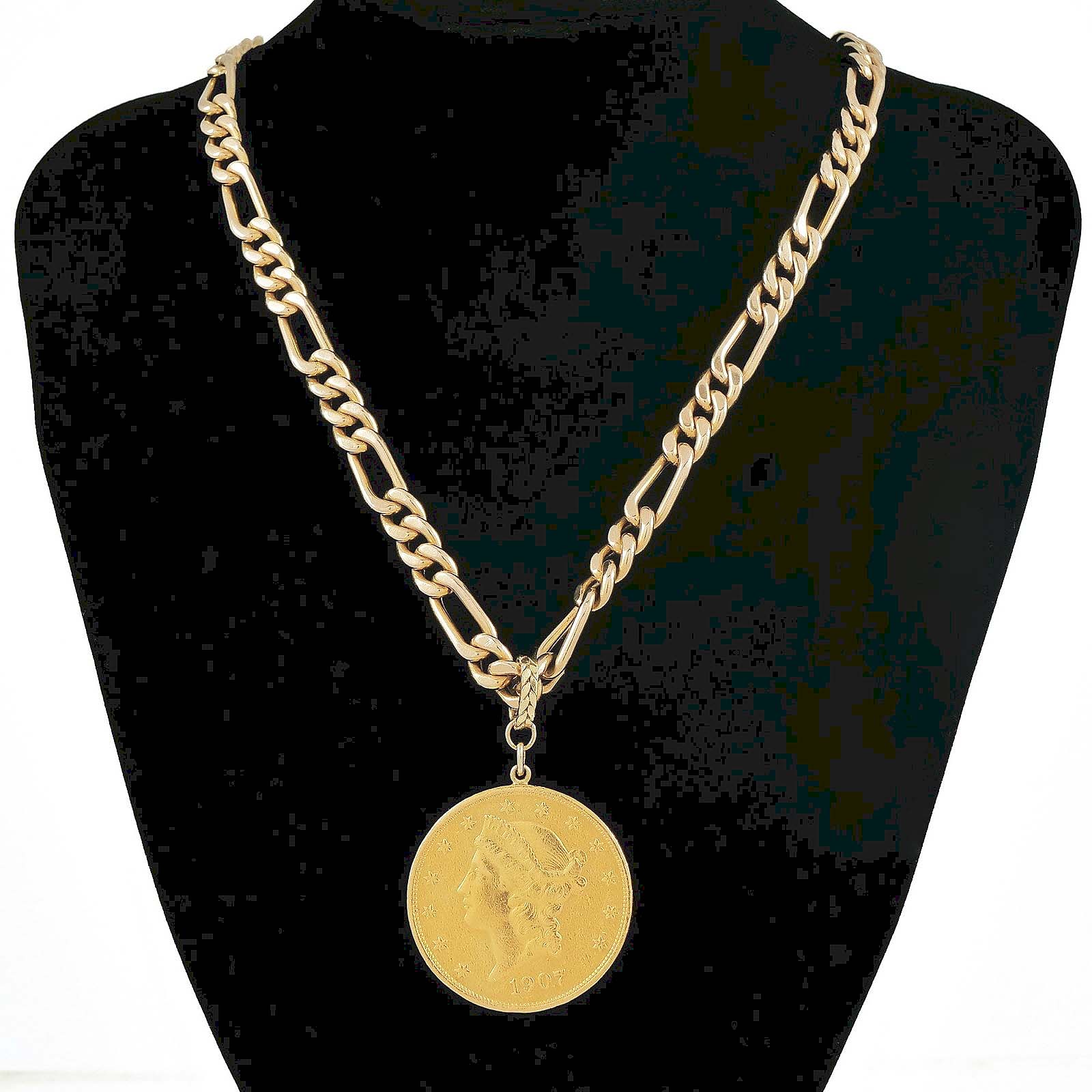 This 1907 $20 Liberty Head Double Eagle gold coin necklace on a 14K Italian chain sold to a phone buyer for $10,160 ($7/9,000).