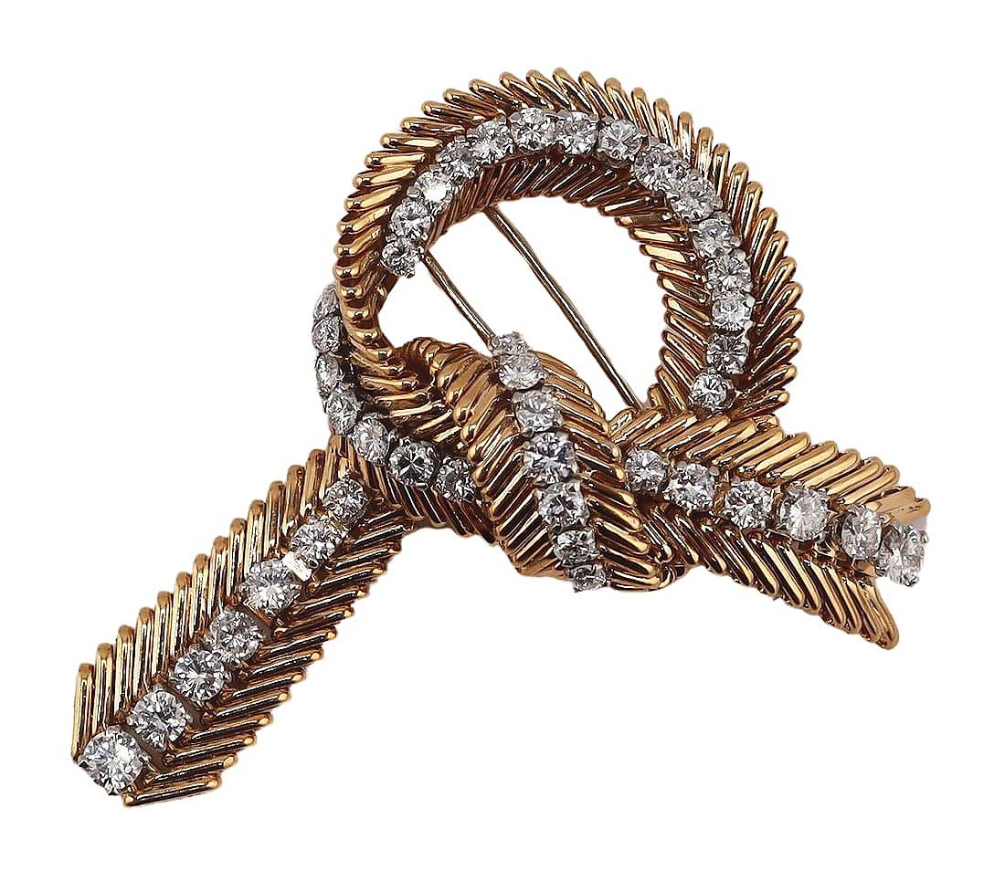 LARCHMONT, N.Y. — Clarke Auction Gallery conducted a 611-lot New Year Special Estates Auction on January 11, led by an 18K gold and diamond brooch from Van Cleef & Arpels. The brooch, a gold chevron link tied knot form, was accented by bands of round brilliant-cut diamonds (42 total). It measured about 2 inches wide and weighed just under 15 pennyweights. Bidders pushed the brooch past its $2/3,000 estimate, sticking a pin in it at $12,500. For information, www.clarkeny.com or 914-833-8336.
