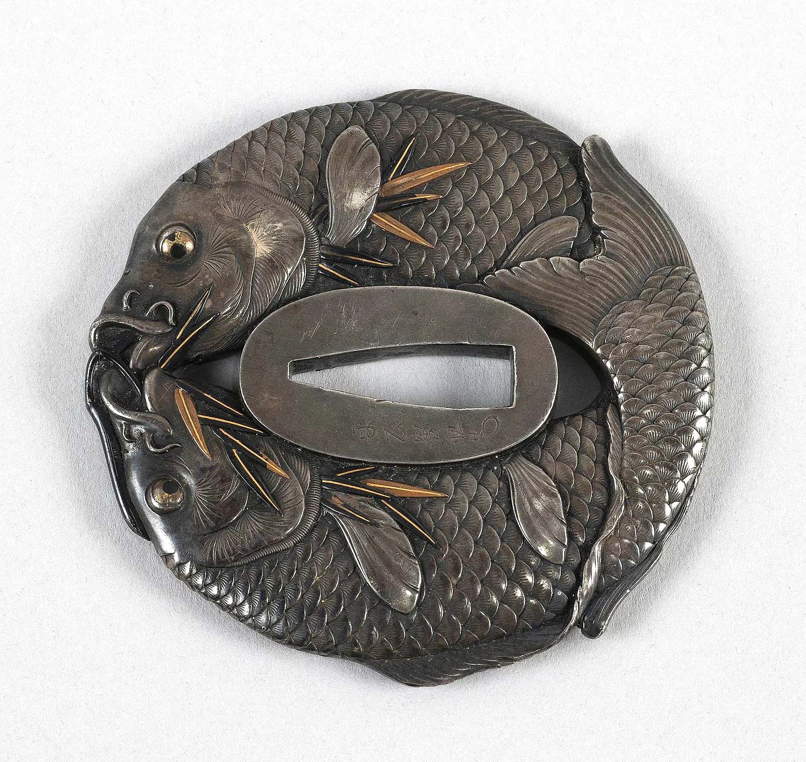EAST DENNIS, MASS. — Sought after by collectors of miniatures, militaria, Asian art and historical artifacts, a Japanese mixed metal tsuba had everything going for it. Besting its $200/500 estimate to attain $8,960 in Eldred’s Auction Gallery’s January 15, the Twentieth Century sword guard bore intricate decoration of two carp and was signed with a four-character gyosho mark and kakihan. Its size was pleasing, having a 3¼-inch diameter and weighing 264 grams. For information, www.eldreds.com or 508-385-3116.