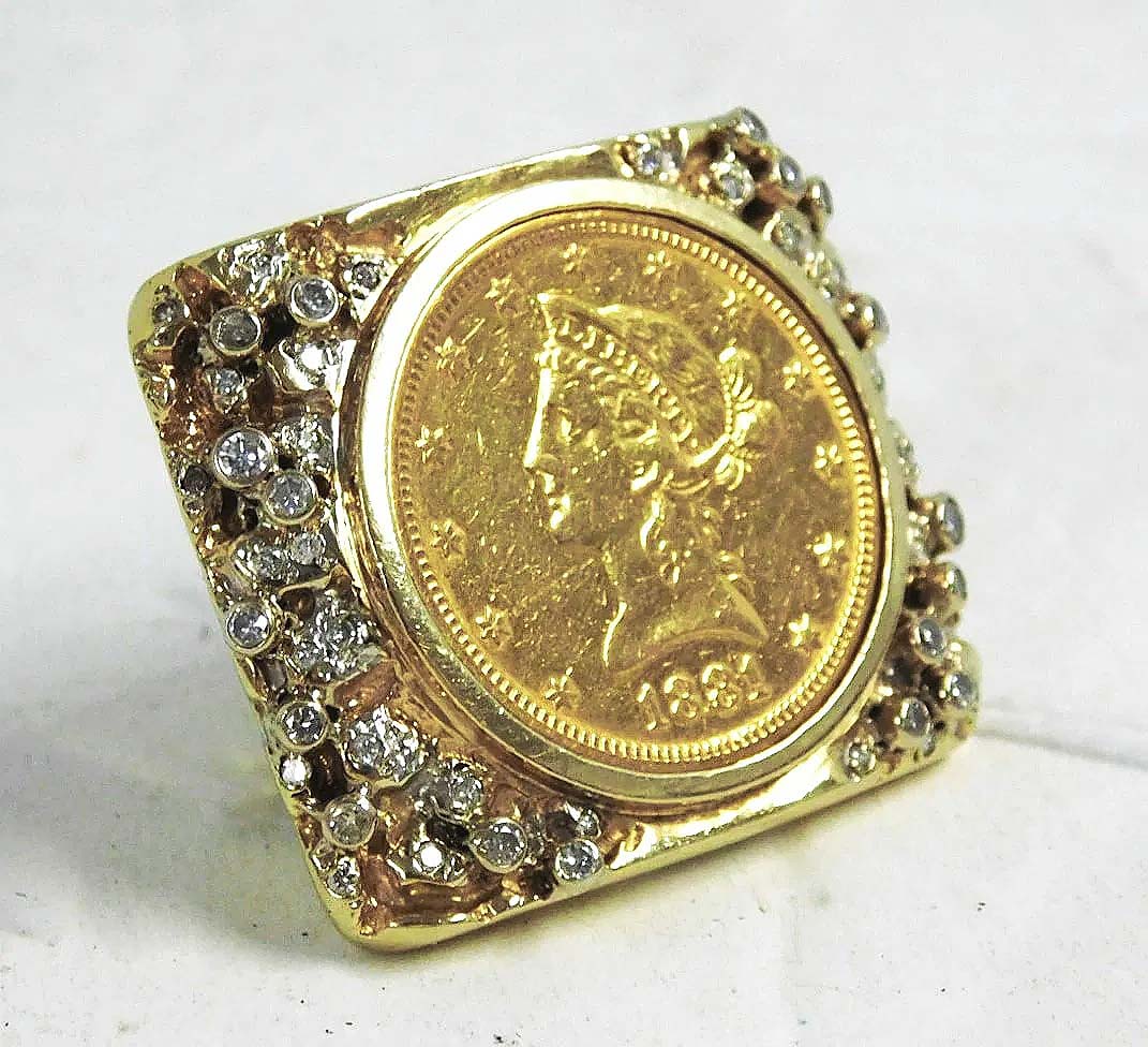 PINE BUSH, N.Y. — A 14K man’s ring with a $10 gold coin in a bezel setting with 50 small diamonds achieved $5,125 at Roberson’s Auctions on January 17. The ring, sized 9½, sold within estimate. For information, www.robersonsauctions.com or 845-283-1587.
