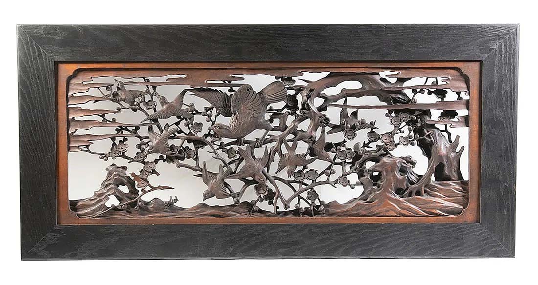 THOMASTON, MAINE — The top lot of Vintage Accents Auctions’s January 16 Cabin Fever auction was a Japanese reticulated carved window panel in rosewood, having an ebony panel frame featuring birds among flowering trees with an encroaching mist. The panel took $687 and measured 19½ by 41½ inches. For information, 207-354-8350 or www.vintageaccents.com.