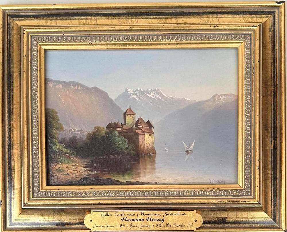 WOODBURY, CONN. — Schwenke Auctioneers’ 595-lot February Fine Estates Auction, conducted February 17, was led by an oil on board painting by Hermann O. Herzog (German-American, 1832-1932). The scene, showing Chillon Castle near Montreaux, Switzerland, was signed “H. Herzog” to the lower right and came from a New Jersey estate. The 10⅜-by-12⅞-inch framed painting sold to an online buyer for $7,980. For information, www.woodburyauction.com or 203-266-0323.