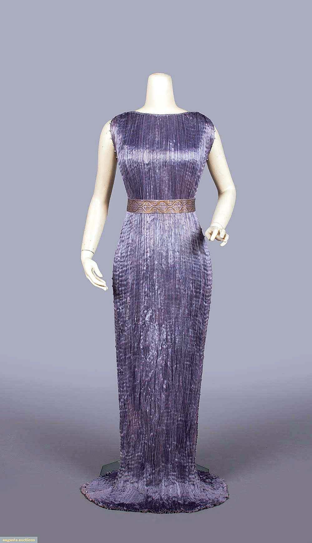 BELLOWS FALLS, VT. — An eye-catching Fortuny Delphos gown in pleated lavender silk with its original gold stenciled belt attained $23,125 at Augusta Auctions on February 18. Originally bought in Italy, the circa 1930 sleeveless gown was adorned with purple and cream striped Murano glass beads and its selvedge was stamped “Fortuny Depose.” For information, www.augusta-auction.com or 802-463-3333.