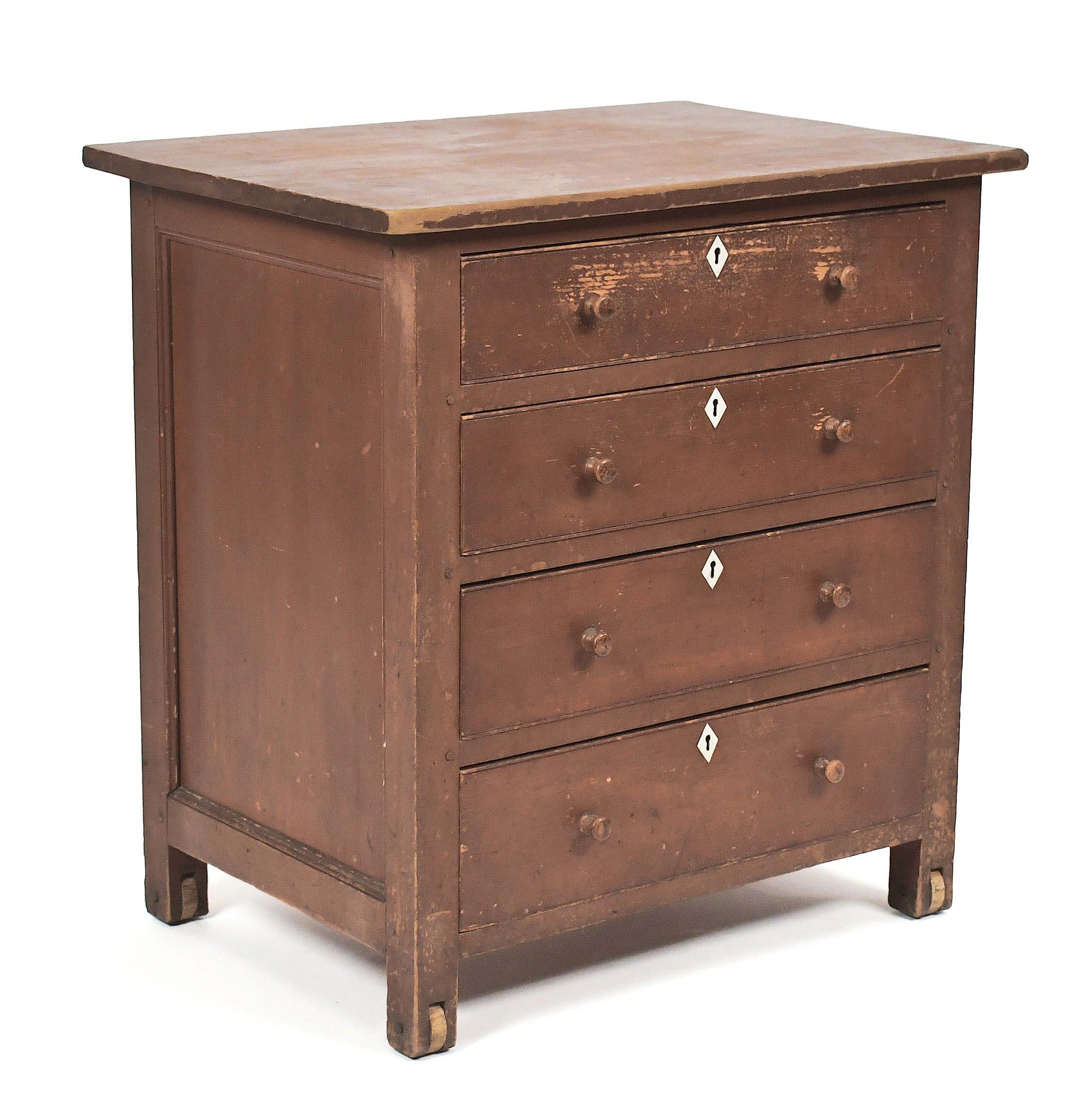 PLAINFIELD, N.H. — A mixed bag of lots from a Scottsdale, Ariz., estate and selections from the collections of Mass General Hospital chief of urology Dr George Smith and US Ambassador David Kenneth Rush made up the 544-lot Important Winter Live Auction conducted on February 25 by William Smith Auctions. A rare Nineteenth Century small painted Shaker chest on wheels was the top lot, selling for $45,000 to a buyer in Michigan, just outside of Lake Huron. The chest had a pegged and paneled case containing four dovetailed graduated drawers and came with all of its original wooden knobs. For information, www.wsmithauction.com or 603-675-2549.