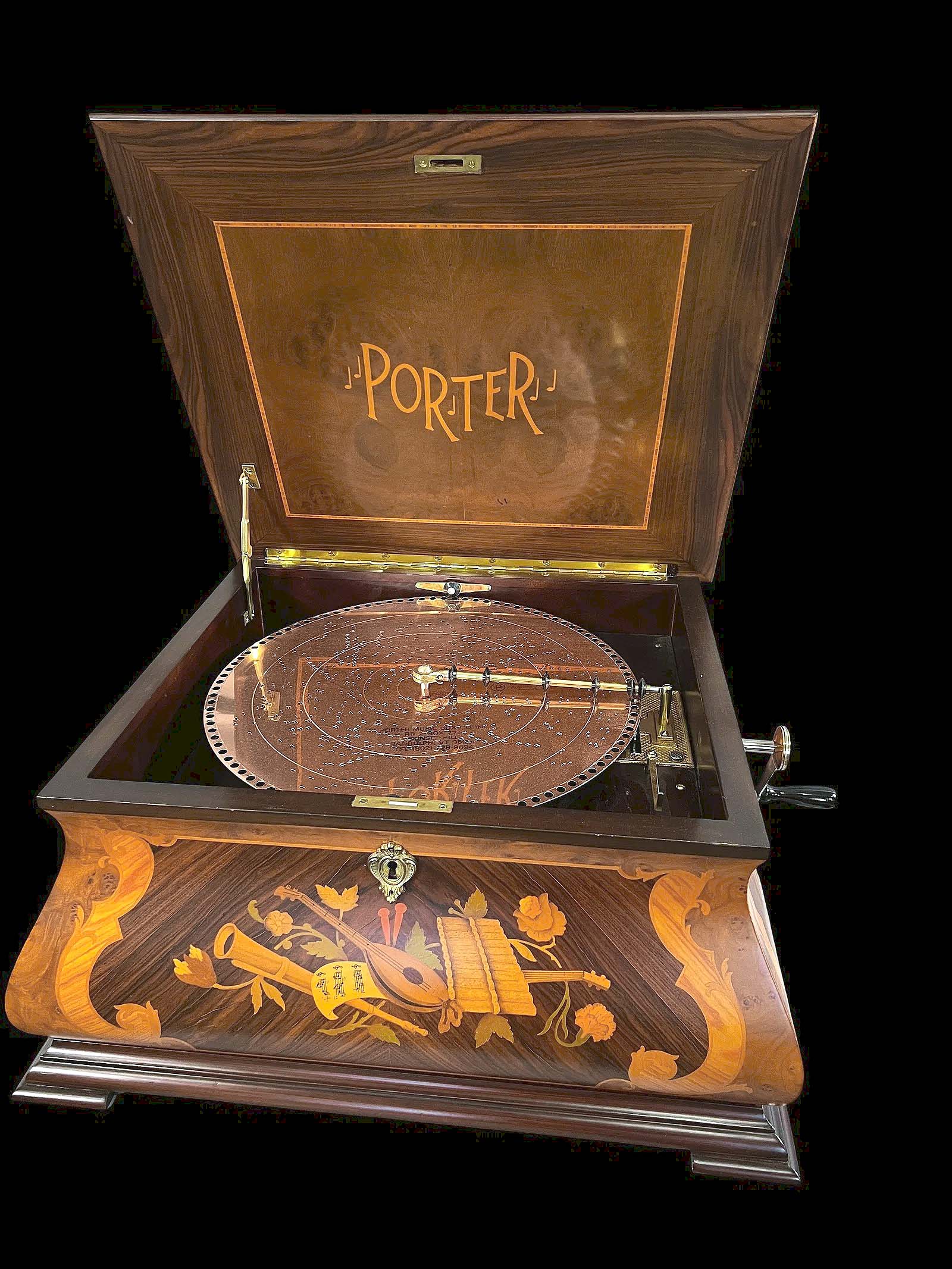 BROOKSTON, IND. — Making sweet music at Synesael Davies Auctions was a Porter Baroque music box that was inlaid and had fine veneer. Playing 15½-inch metal discs, the music box sold just over high estimate to a private collector bidding online for $4,025. Noted for having a wonderful tone, auctioneer Kenny Synesael explained, it came with copper punched discs, including several Christmas music titles. Nearly two dozen bidders were interested in the music box in advance, and six buyers actively competed for it. For information, www.synesaeldaviesauction.com or 765-404-5014.