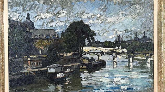 BELLPORT, N.Y. — A selection of slightly more than 600 lots of Midcentury Modern furniture, fine art and global antiquities made up Cornell Auctions, Objects & Trade’s February Fever auction. The highest-earning lot of the day was an “atmospheric post-Impressionist cityscape” depicting the River Seine in Paris by Constantine Kluge, which had provenance to the collection of a New York museum. The painting is headed to an antiques dealer in the South, who purchased the work for $3,670. For information, www.cornellauctions.com or 631-289-9505.