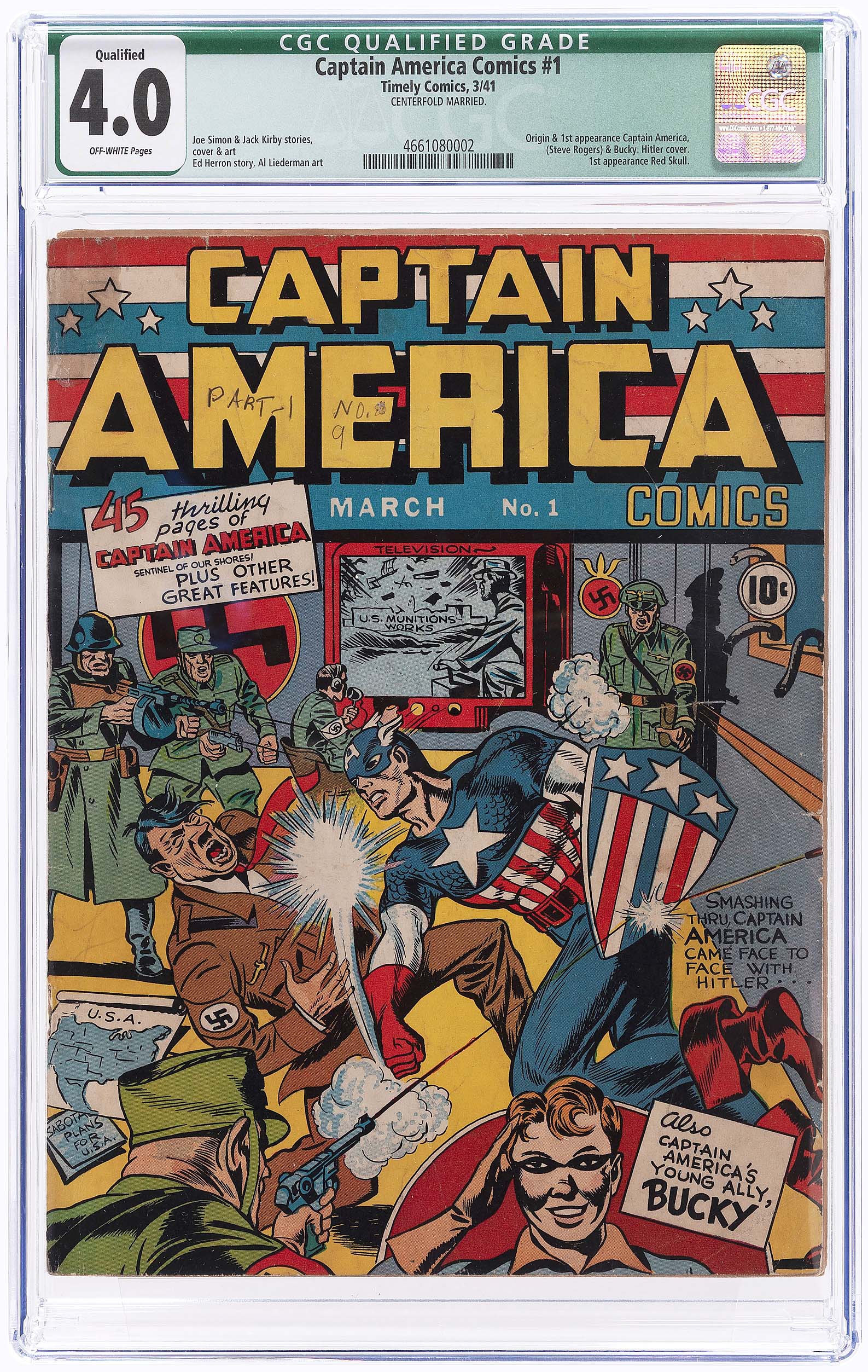YORK, PENN. — Hake’s Auctions conducted its 246th auction on March 25, with a March 1941 copy of Captain America Comics #1 earning top-lot status at $71,554 against a $35/50,000 estimate. Rated 4.0 (Very Good) by the CGC, the comic, which had art by Joe Simon, Jack Kirby and Al Liederman, featured the origin and first appearances of Captain America, Bucky Barnes and their nemesis, Red Skull. For information, 717-434-1600 or www.hakes.com.