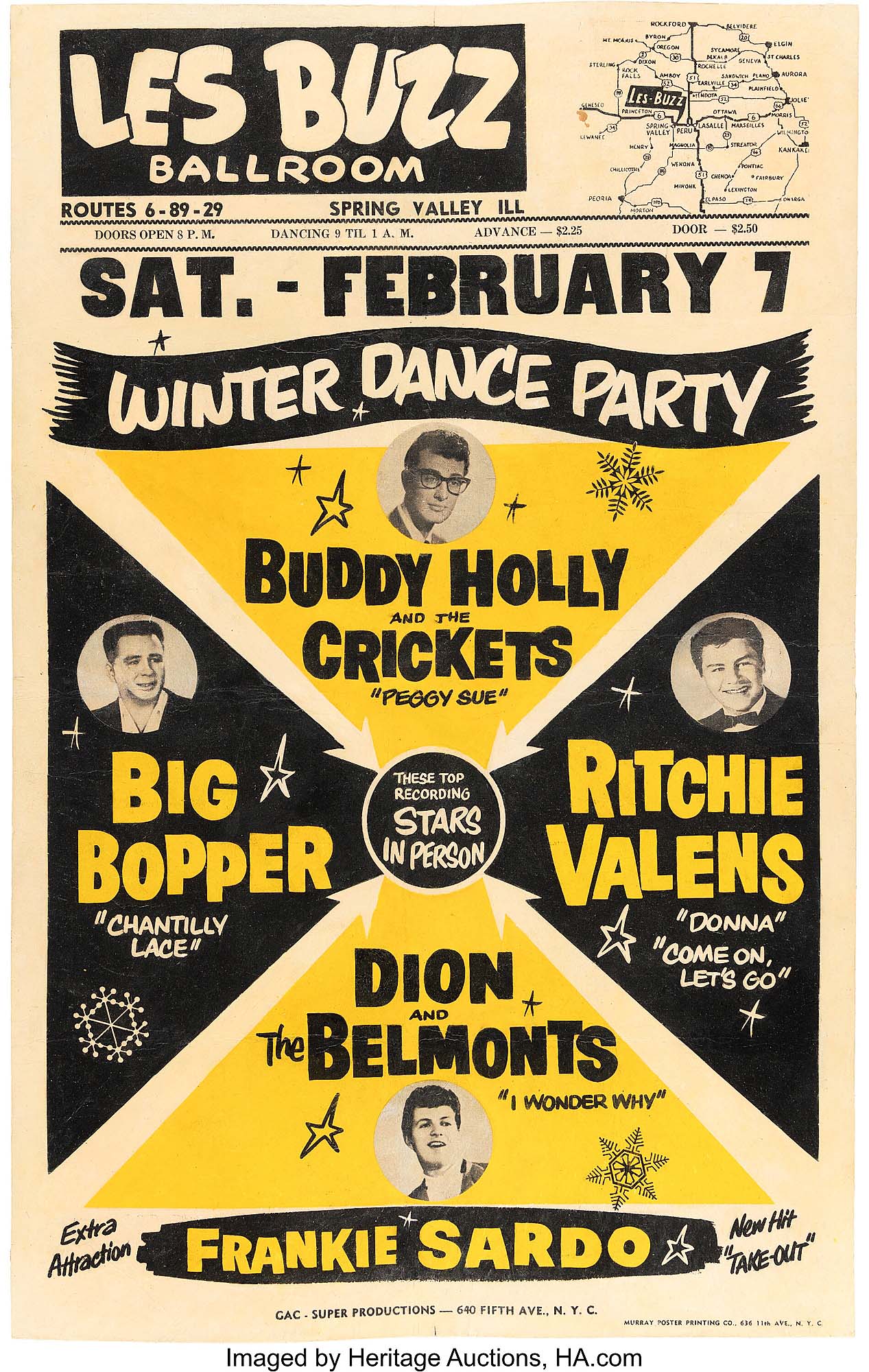 DALLAS — A 1959 Winter Dance Party poster sold for $100,000 to lead Heritage’s Concert Posters Signature Auction on April 10. This relic was created before the tour to sell tickets for Buddy Holly and the Crickets, Ritchie Valens, the Big Bopper, Dion and the Belmonts and Frankie Sardo playing at the Les Buzz Ballroom in Spring Valley, Ill., on February 7, 1959. Just five days before that date, the three top headliners died in a plane crash; Holly was laid to rest in his hometown the following Saturday, February 7 — the date of the show on this poster. While all Winter Dance Party posters are rare, this is the only poster from the Spring Valley show to ever surface. For information, www.ha.com or 214-528-3500.