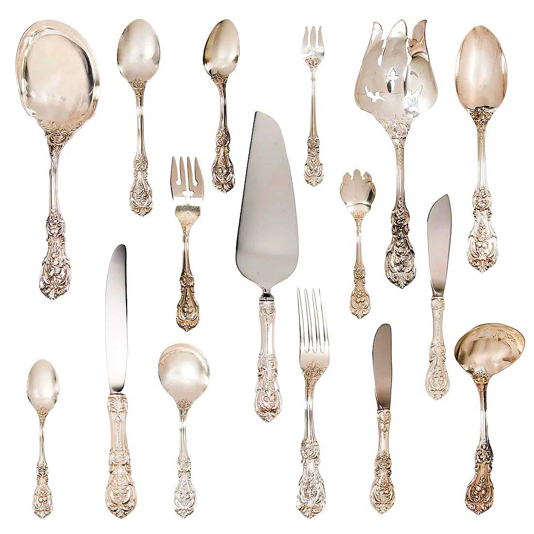 OAKLAND, CALIF. — A standout in Clars’ April 17 Gallery Sale was an extensive Reed & Barton sterling silver flatware service in the Francis I pattern that sold within estimate at $19,200. The set totaled 251.39 troy ounces and included 25 dinner forks, 15 ice cream forks, 18 oval soup spoons, 29 dinner knives and more specialized cutlery, in addition to serving pieces. For information, www.clars.com or 888-339-7600.