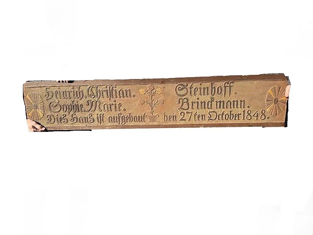 Commemorating the construction of the home of Heinrich Christian and Marie Steinhoff-Brinckmann on October 27, 1848, this Pennsylvania German carved wooden plaque, 11½ by 57 inches, earned the highest price of the sale at $1,920.
