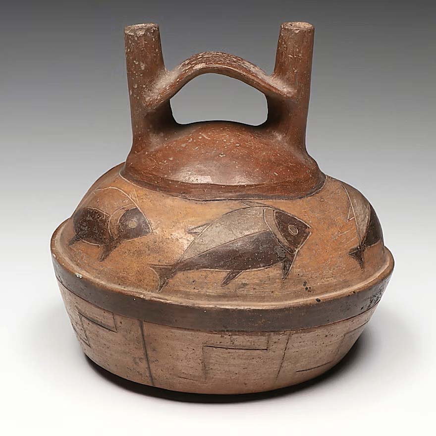 Another example was a polychrome double spout with bridge bottle from the Fourth to Sixth Century. It had incised and slip decoration of fish and sold for $576. The double spout and bridge vessel is one of the oldest forms used in ceramics known in Nasca art.