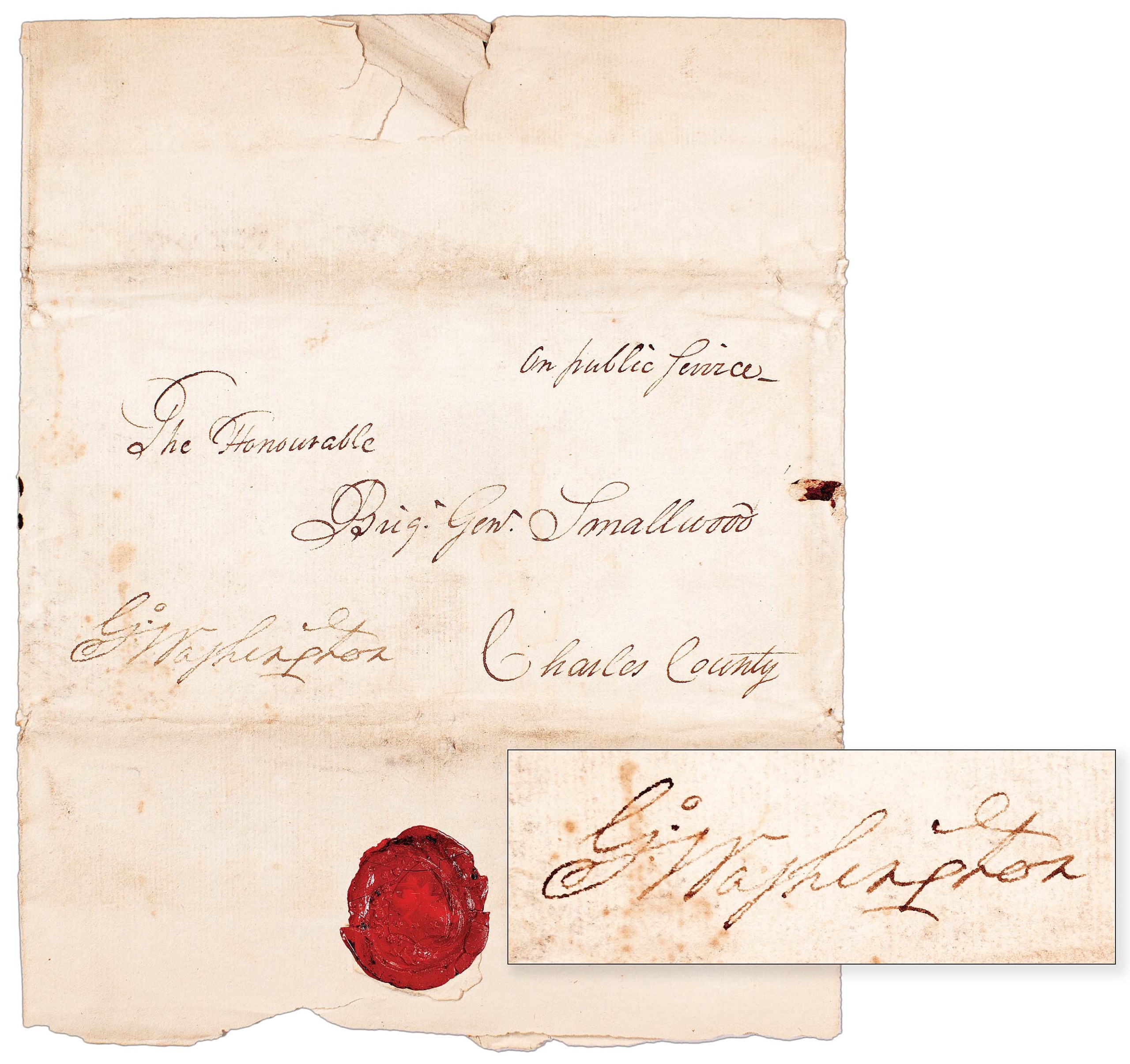 Signed “G. Washington,” this free frank transmittal cover sent to “The Honourable Brig. Gen. Smallwood” and the personal red wax seal of George Washington was finely preserved; it shipped off to a new owner in California for $32,500 ($15/20,000).