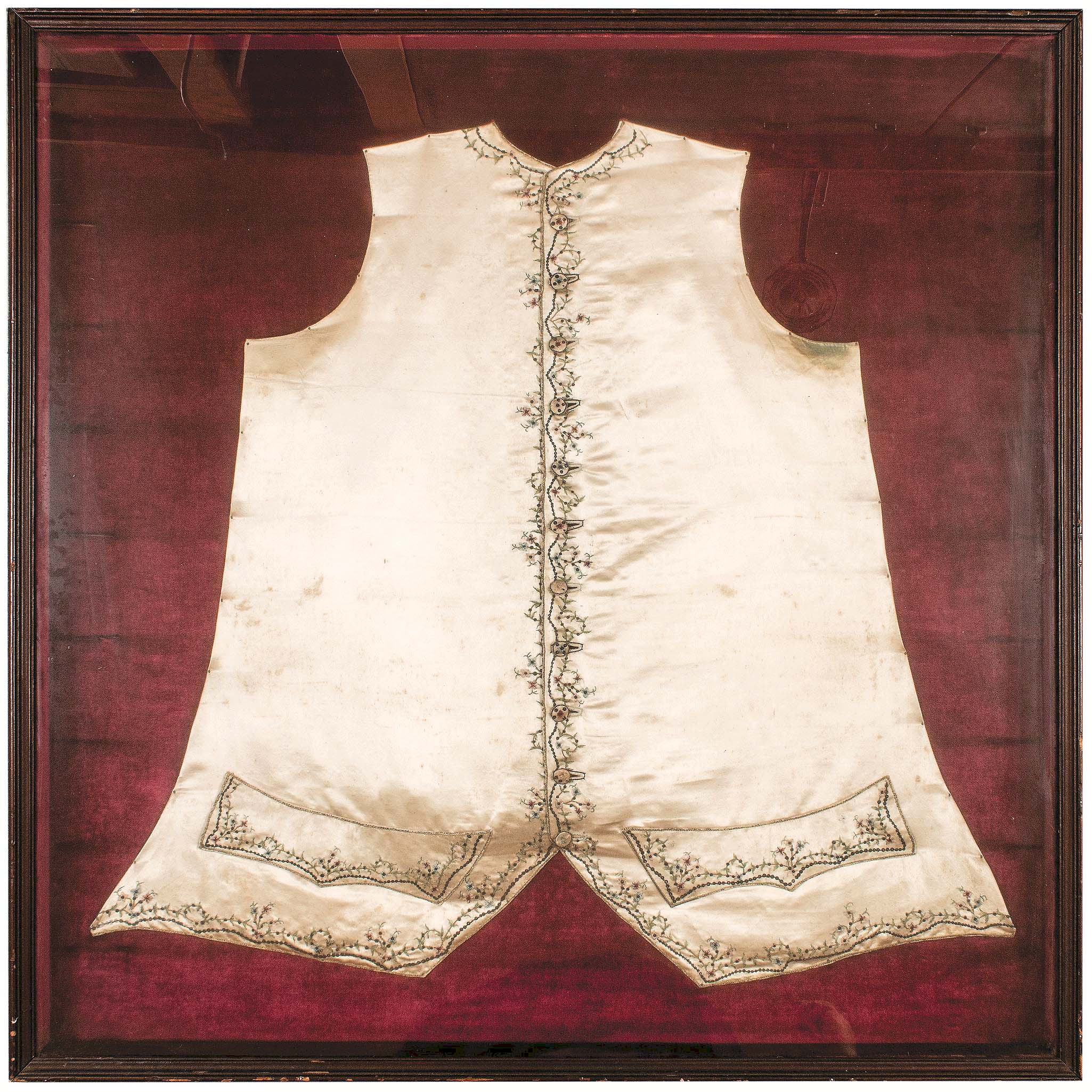 This embroidered silk Revolutionary War-era militia officer’s waistcoat, circa 1778-80, belonged to Dr Samuel Nicoll — courier, possible spy and emissary — was mounted behind glass in a 36-by-36-inch wooden display case. It traded hands for $25,000 ($10/20,000).