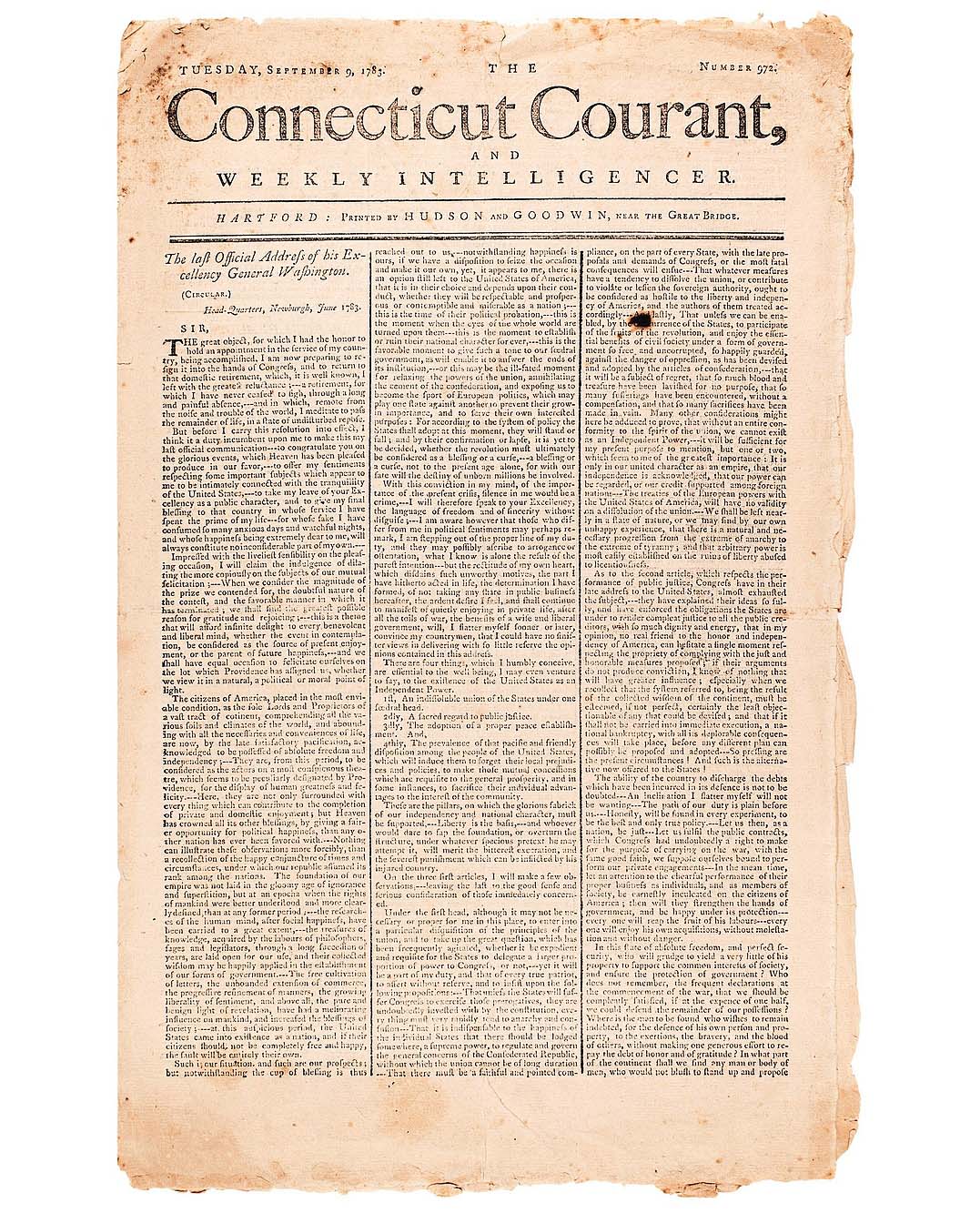The September 9, 1783, issue of The Connecticut Courant featured “The Last Official Address of his Excellency General Washington…” on its front page. Measuring 17 by 11 inches, this complete four-page original edition realized $13,750 ($4/5,000).