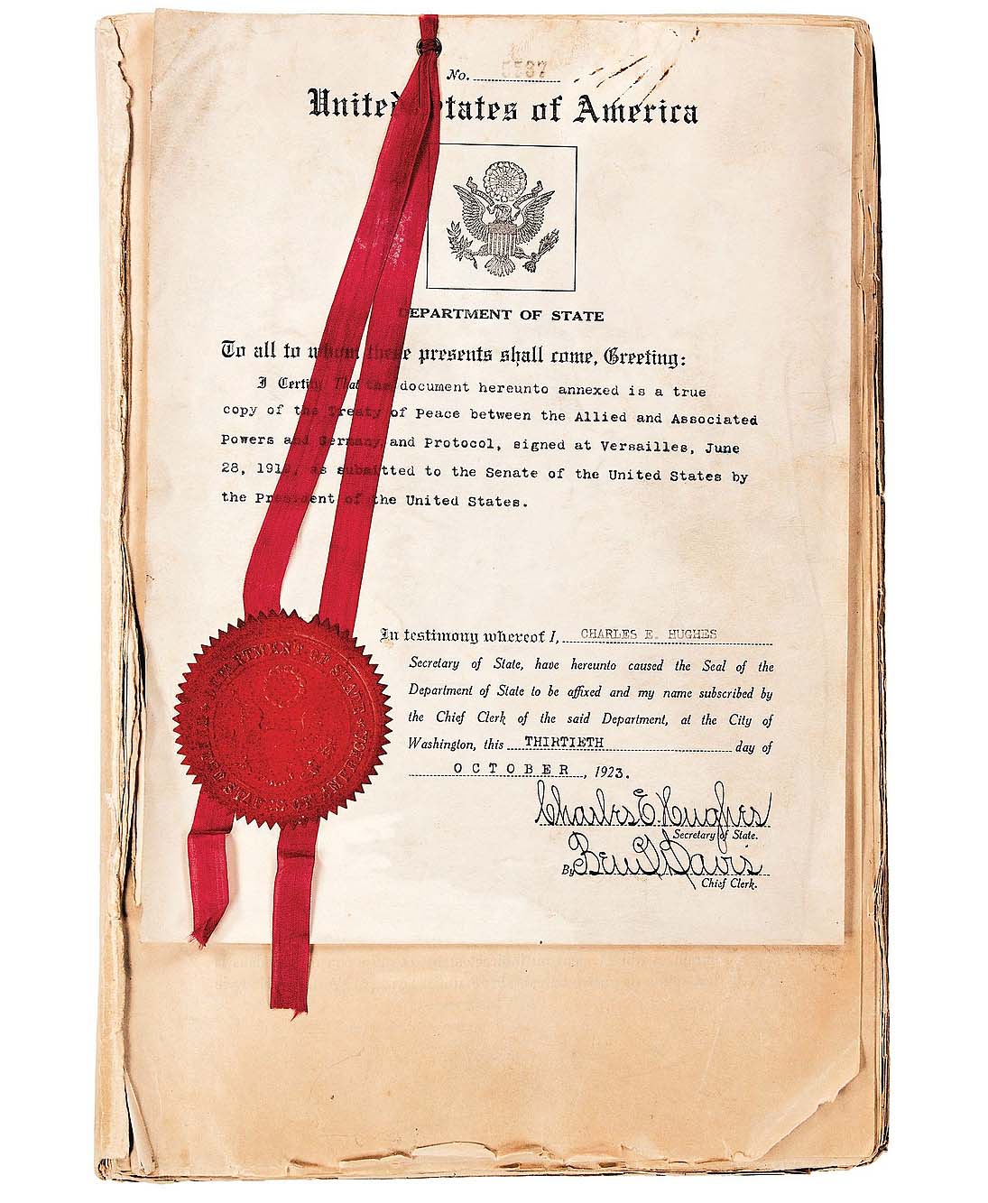 Realizing $8,125, this true copy of the Treaty of Versailles had a cover sheet from Secretary of State Charles E. Hughes dated October 13, 1923 ($5/6,000).