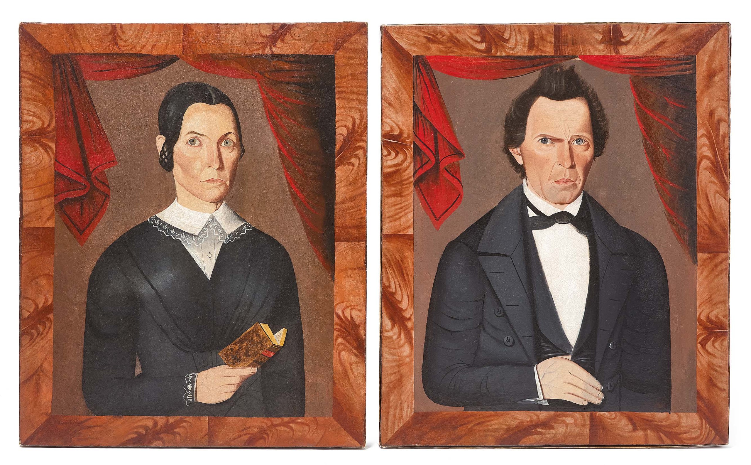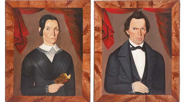 Depicting Lucinda Ann Houck (aged 38 years) and Ross Houck (aged 44 years), these 1849 portraits by Sheldon Peck (1797-1868), oil on canvas, 29 by 23¾ inches, brought the sale’s highest price: $176,400 ($100/200,000).