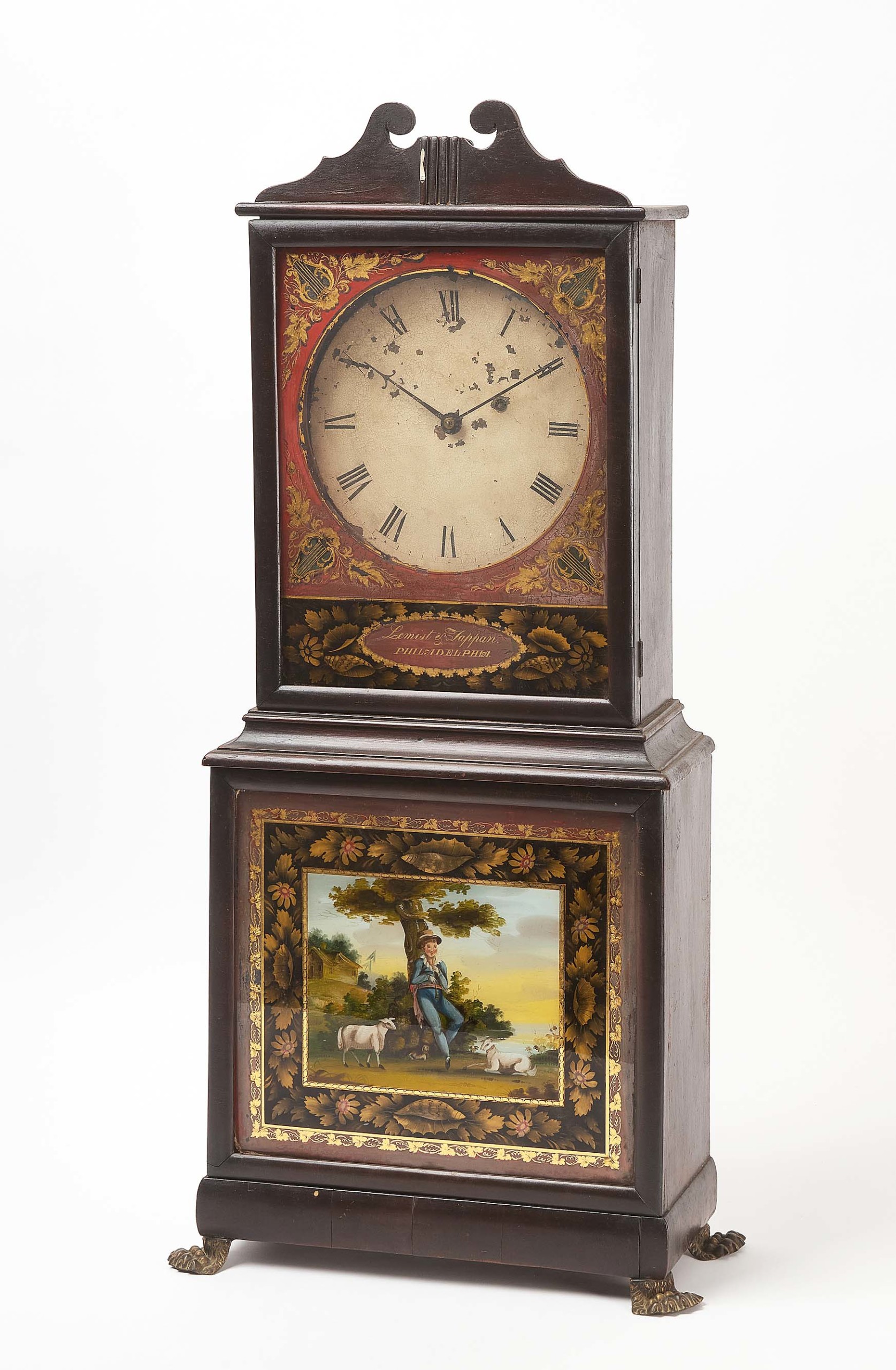 With an image of a young shepherd reverse painted on glass and brass paw feet, this Lemist and Tappan shelf clock, Philadelphia, circa 1915, 37¼ inches tall by 12½ inches wide by 5¾ inches deep, was bought for $27,720 ($1,5/2,500).