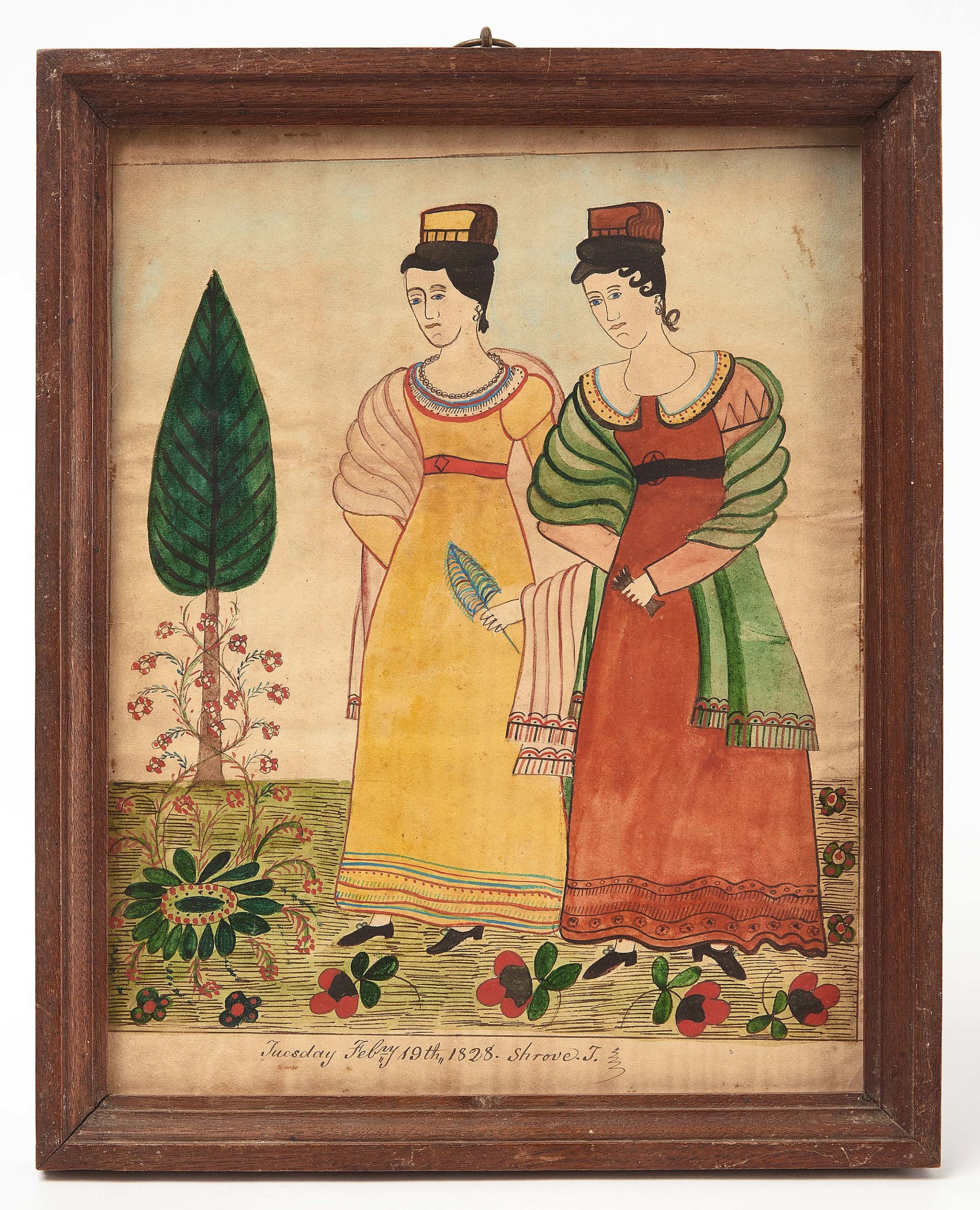 “These watercolors from Augusta County’s Sheets family are remarkable survivors of both time and conflict. One piece, depicting two women in a flower garden is inscribed, ‘Tuesday Feb 19th, 1828. Shrove. T.’ to mark Shrove Tuesday, the festive gathering day before Lent, revealing the Sheets family’s observance of traditional Christian calendar customs common to Germanic communities in the Shenandoah Valley. The Valley, nestled in the Appalachian Mountains of Virginia and where these pieces originated, was devastated during the Civil War. This occurred particularly during General Phillip Sheridan’s ‘Burning’ campaign of 1864 when homes were destroyed and families fled with only what they could carry. Beyond wartime fallout, watercolors from rural communities of this period are notably rare due to the fragility of paper and pigments, and many were lost to neglect when folk art held little perceived value for conservation. As such, these delicate artworks not only survived nearly 200 years of natural deterioration, but also the Civil War’s destruction and generations of family transitions, underscoring them as significant examples of early American folk art and material culture.”