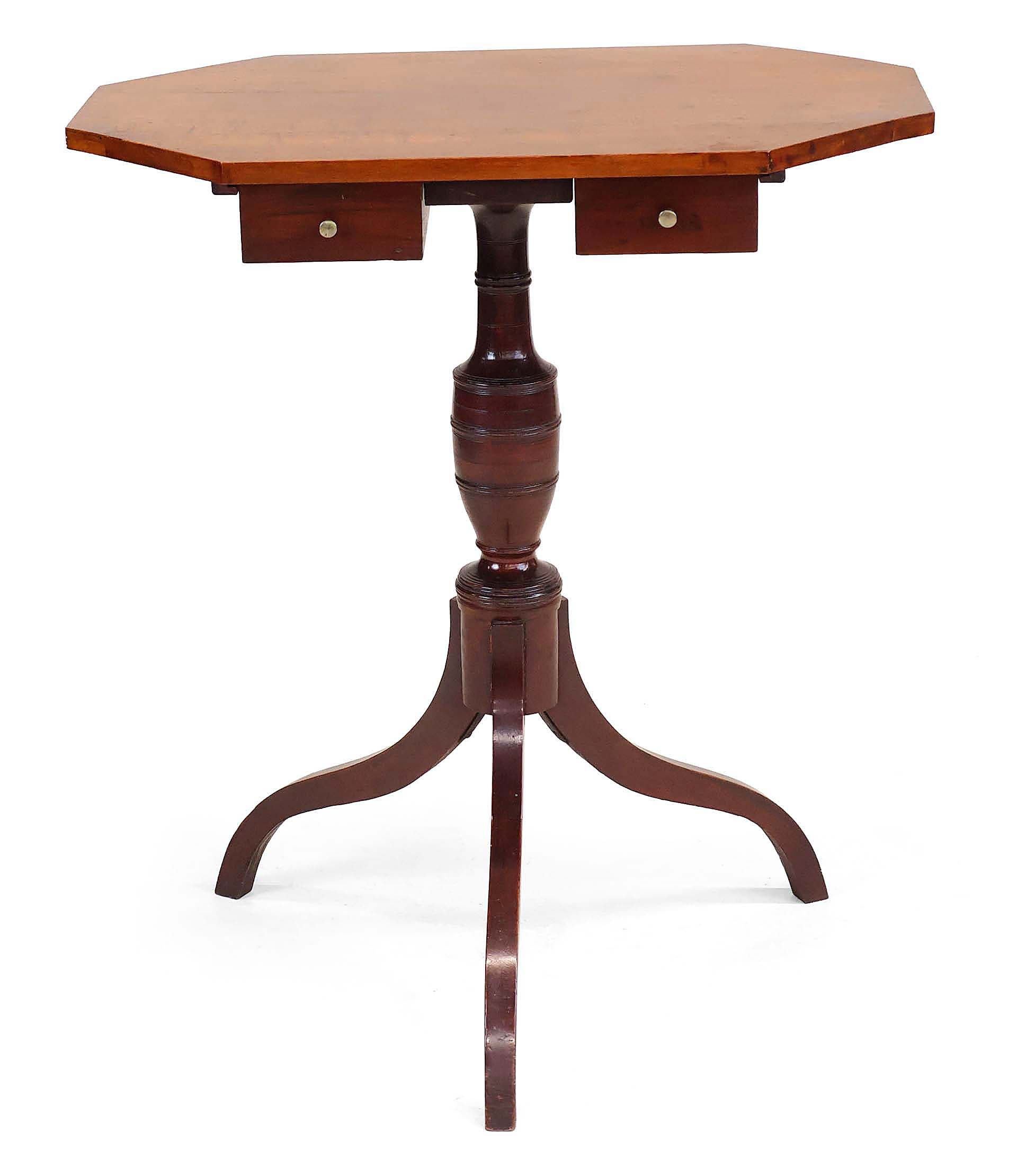 This Federal birchwood two-drawer octagonal candlestand from New Hampshire, 1790-1810, 27½ inches tall with a 24⅜-by-16⅜-inch top, rested at $6,875 ($1,5/2,500).