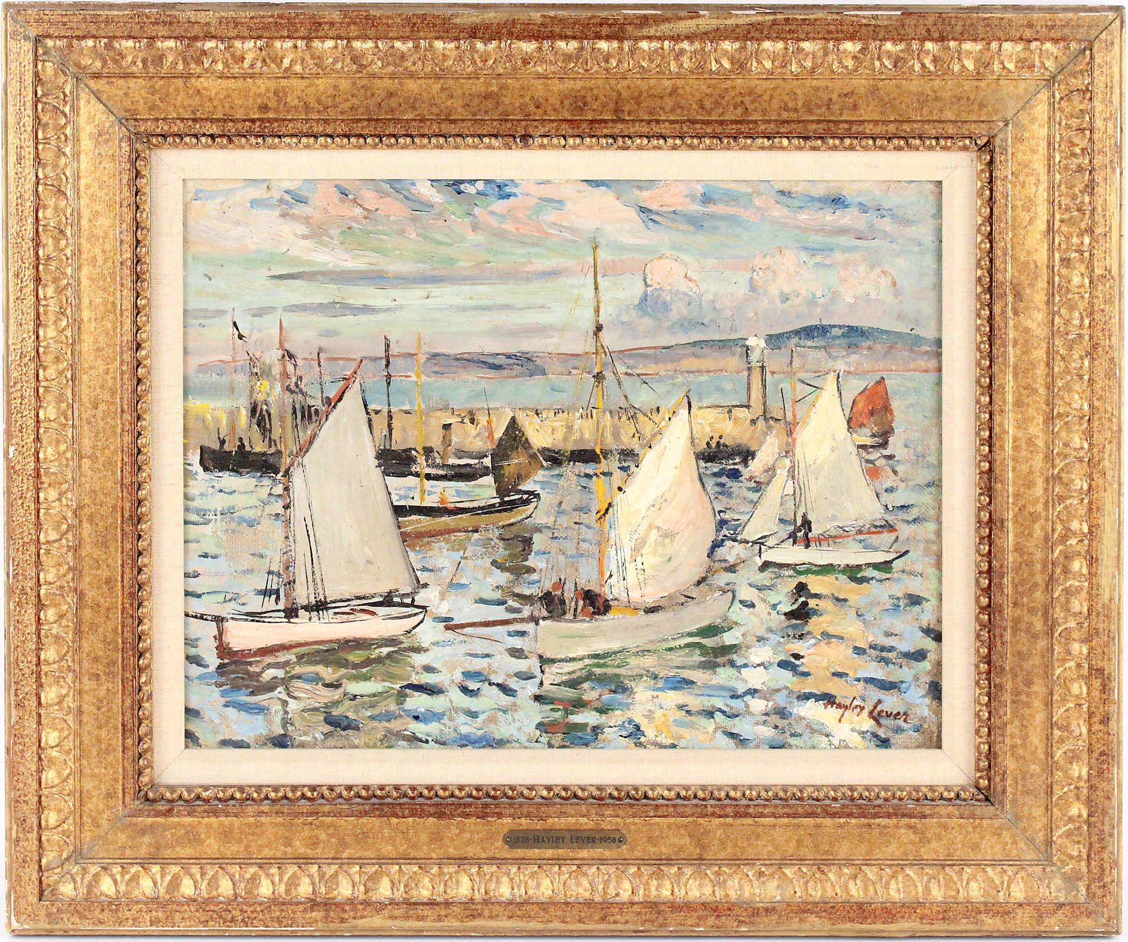 “Sailboats, St Ives” by Hayley Lever (Australian-American, 1876-1958), oil on canvas, 18½ by 22½ inches framed, went out at $5,000 ($5/10,000).