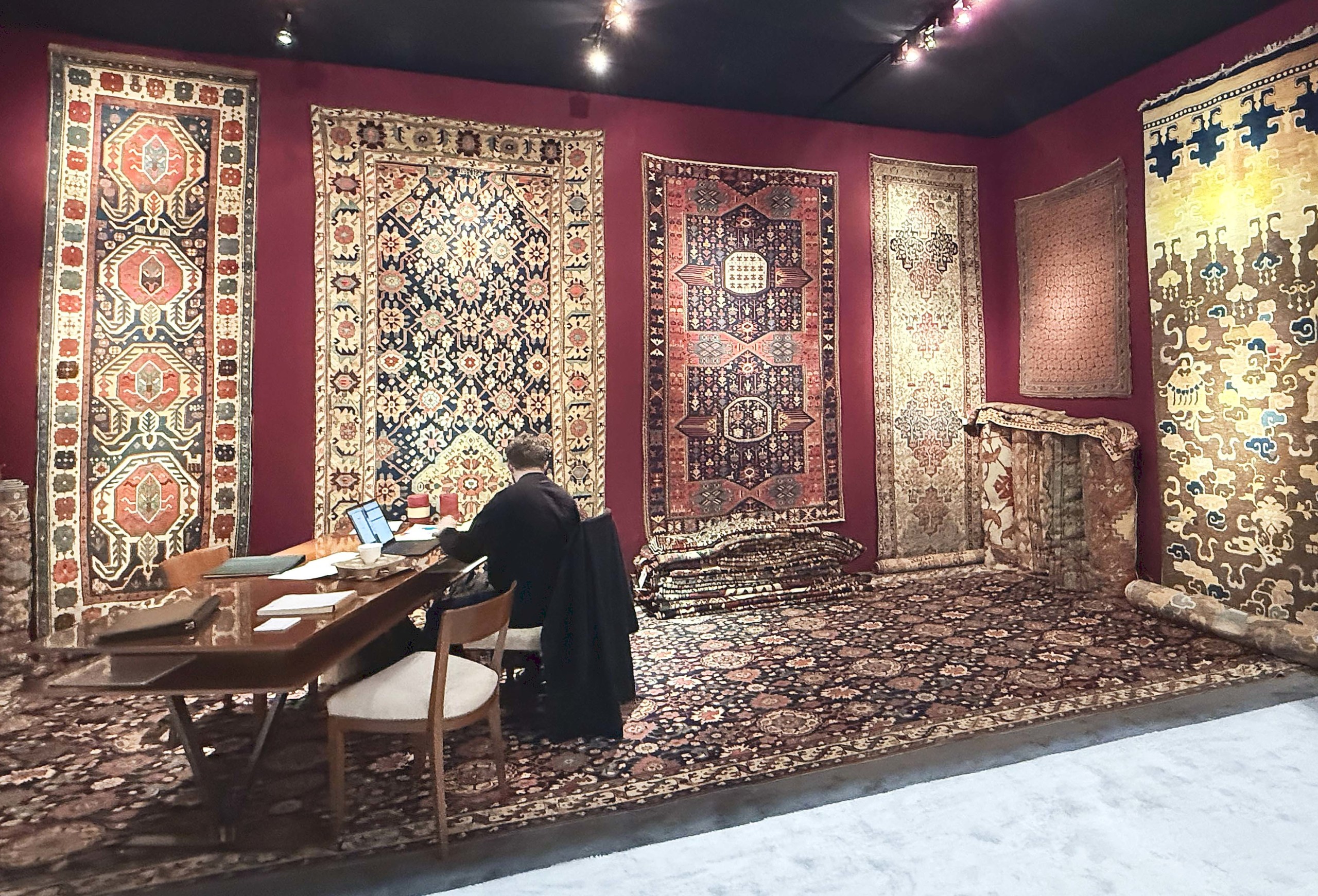 Peter Pap Rugs returned to the show with antique rugs, carpets and tribal weavings. On the floor, a Northwest Persian blossom carpet, early Nineteenth Century. Far right, a Ningxia palace runner, circa 1800. San Francisco and Dublin, N.H.