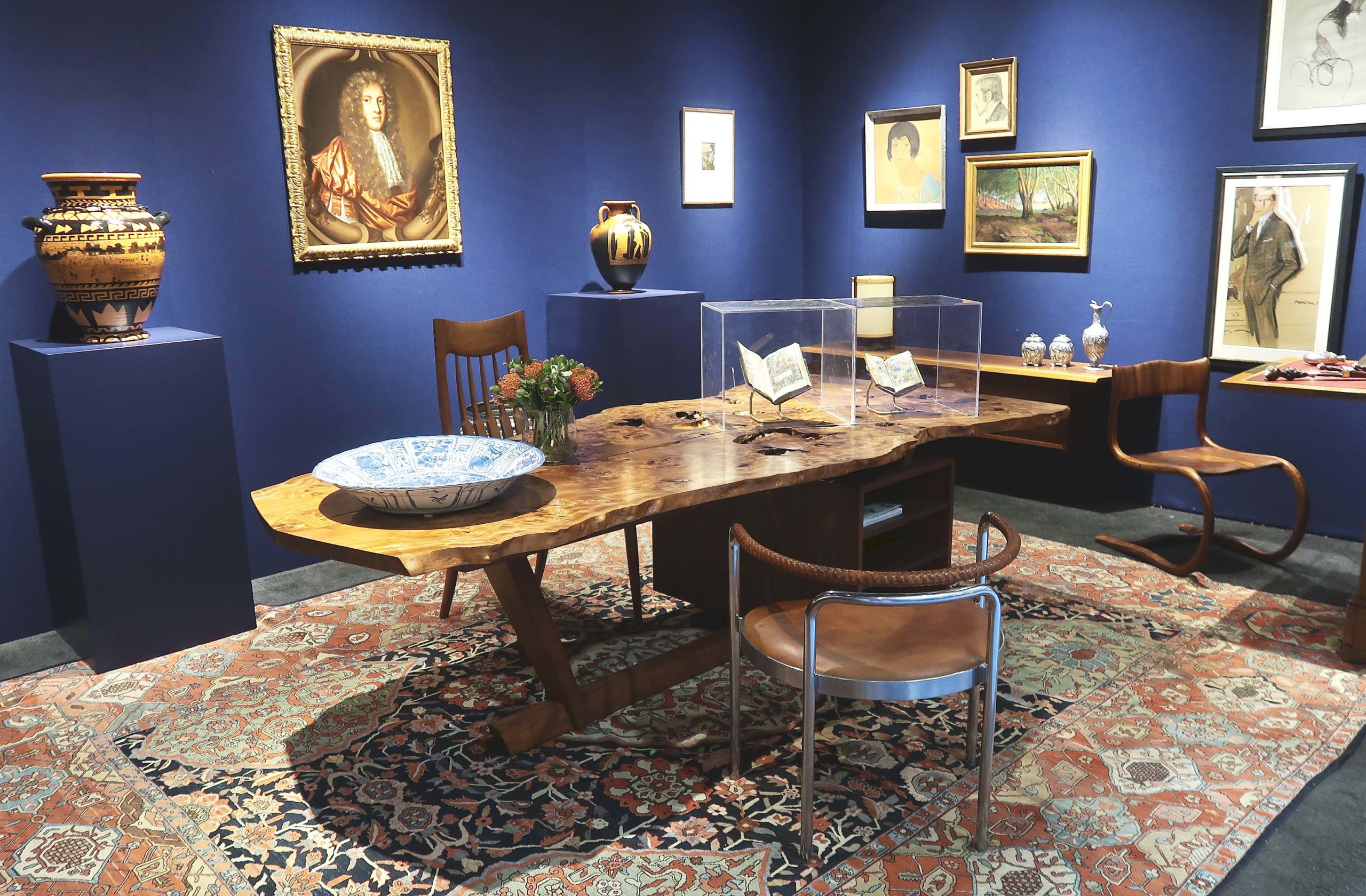 Twelve exhibitors participated in the group display “Study of a Young Collector,” curated by Patrick Monahan and Helen Allen. From Moderne Gallery, center, a Mira Nakashima desk of 1998. Above it, flanking Philip Mould & Company’s “Portrait of a Gentleman” by Mary Beale is, left, from R & Company, Roberto Lugo’s 2023 glazed stoneware vase “Central Park,” from the artist’s “Orange and Black” series, and, right, from Colnaghi, an Attic red-figure amphora decorated by the Tyskiewicz Painter.