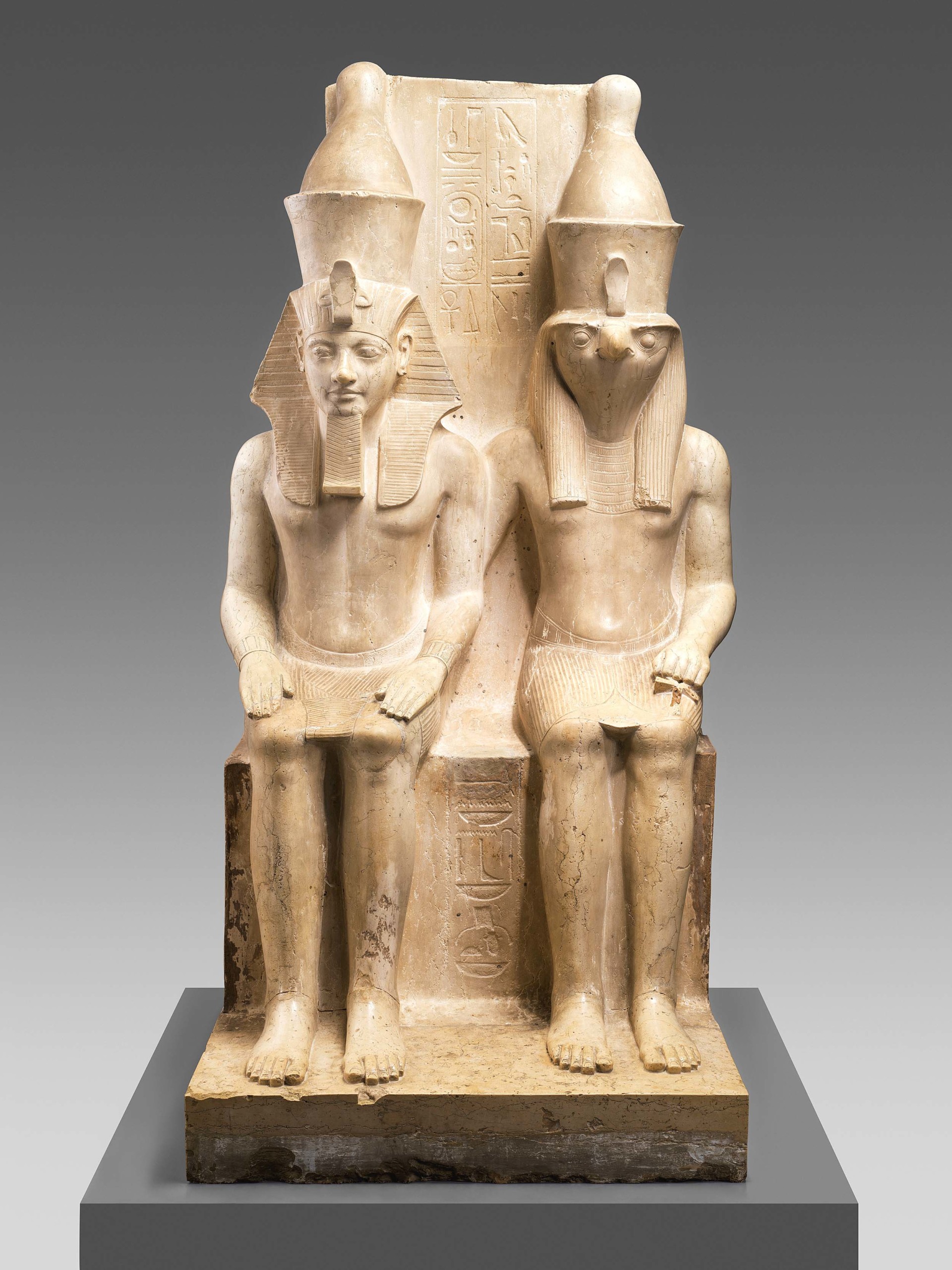 Statue group of the god Horus and the king Horemheb, circa 1323-1295 BCE, stone, limestone. Kunsthistorisches Museum, Vienna, Egyptian and Near Eastern Collection (AE INV 8301). Photo by Anna-Marie Kellen. © The Metropolitan Museum of Art.