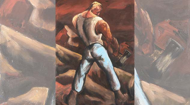 Many workers were employed as lumberjacks in the giant timber industry in the Northwest, and they were a topic for many artists. Kenneth Callahan celebrated the WPA-style brawny, idealized lumberjack in his “Feller,” 1934. But in contrast to WPA dictates, he also honestly portrayed the dangers of physical labor in his “The Accident,” 1939, which shows an injured worker (possibly a miner) being helped by his companion. Callahan’s openness to all aspects of physical labor can be traced to his previous study abroad with the “founding fathers” of the Mexican mural movement: Orosco, Rivera and Tamayo.