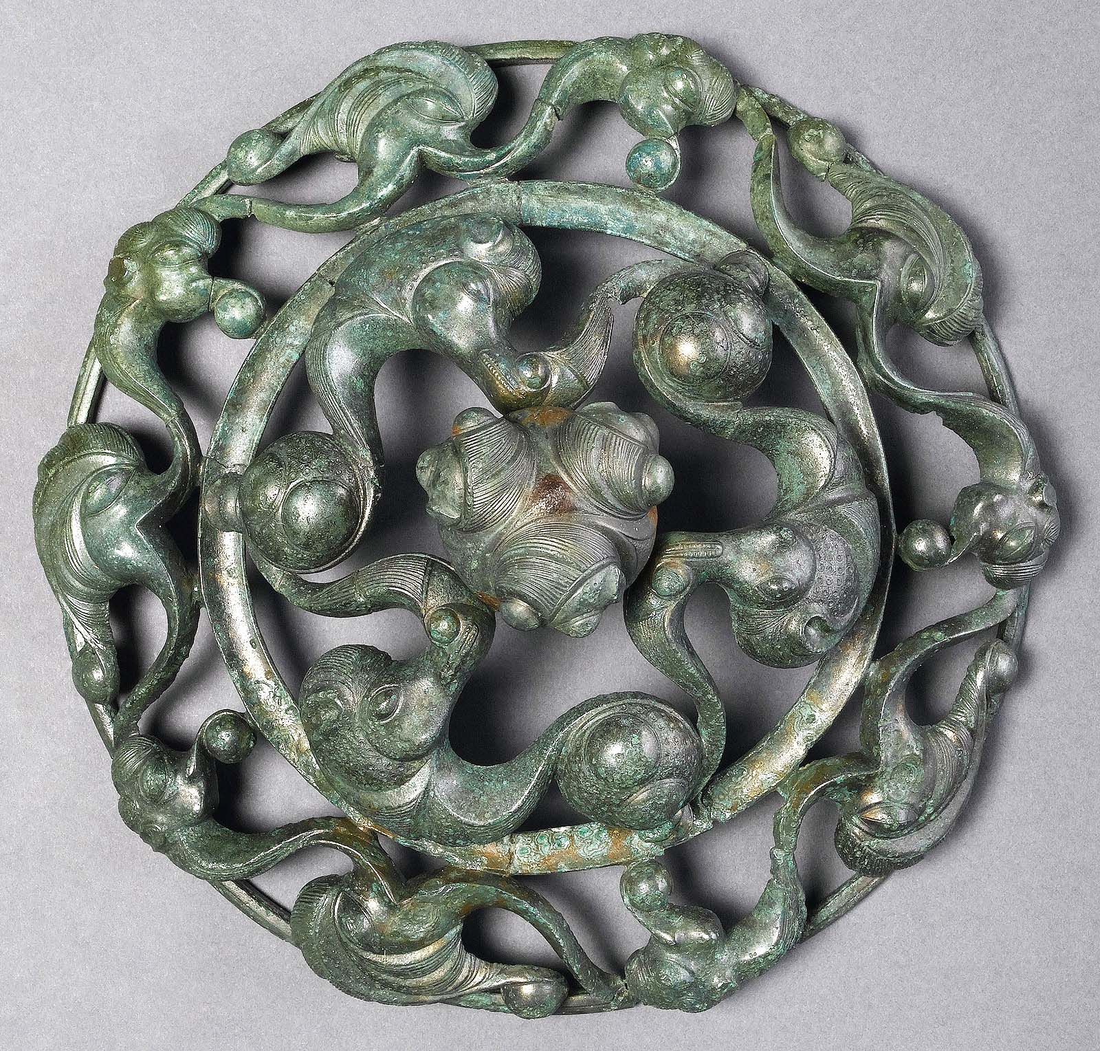 The sandstone head from 450-380 BCE; the gold-plated bronze on iron ornament, circa 430 BCE; and the Third Century BCE dome with dragons all exhibit the common Celtic interest in symmetry, parallelism and repetition of stylized shapes to construct even more complex creations. When you consider how ancient Celtic forms have, over centuries, become the “Celticism” of popular culture — think of leprechauns and other little people, underworld gods and goddesses, ley lines of power, rings of power and, of course the fictions of Tolkien and his many descendants and imitators — it’s tempting but dangerous to graft the popular present onto the distant past and locate these same images and tropes in the ancient Celtic cultures themselves.