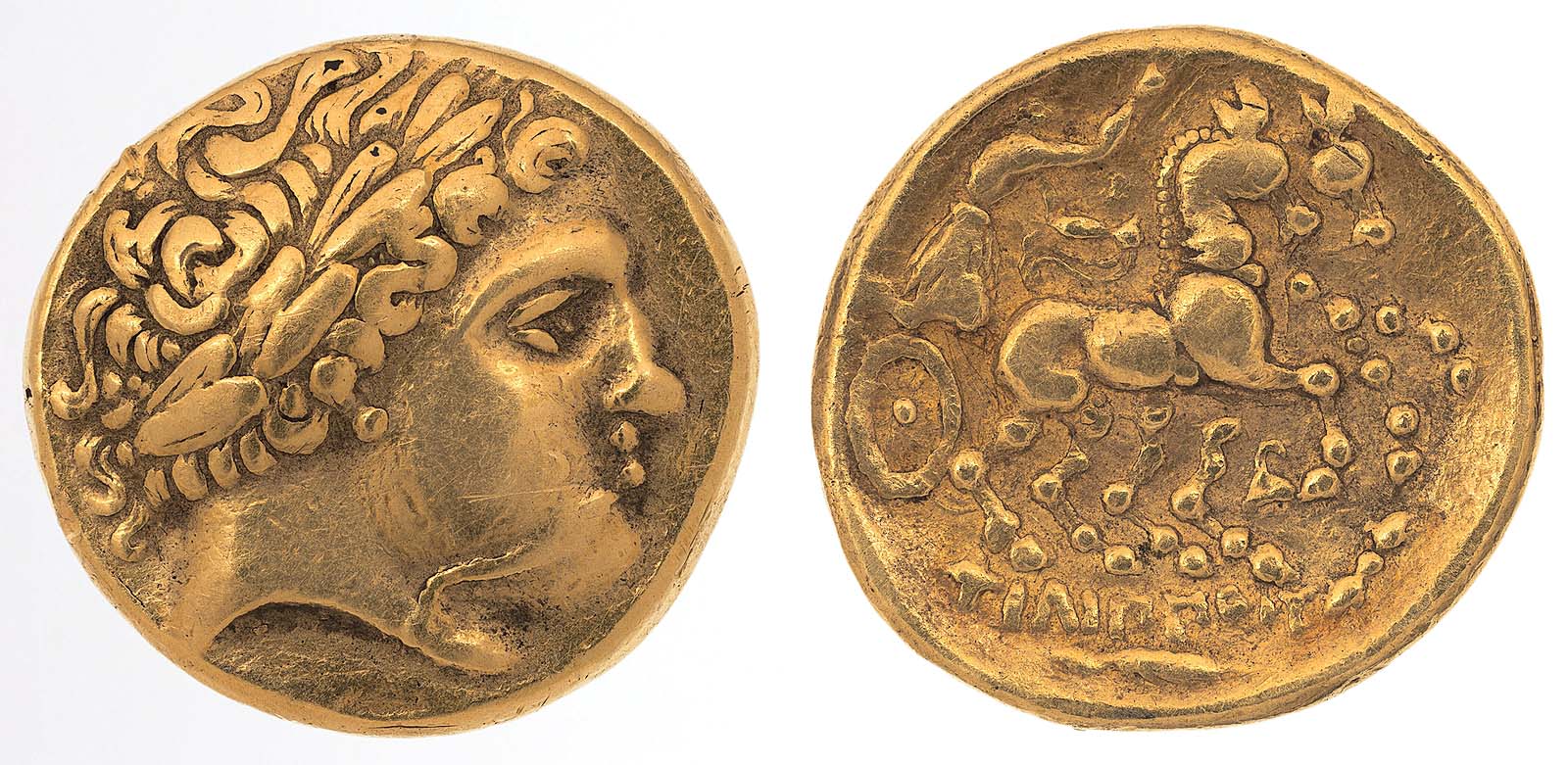 Stater, uncertain mint in east-central Gaul, Second Century BCE, gold, 8.17 grams. Harvard Art Museums/Arthur M. Sackler Museum, Loan from the Trustees of the Arthur Stone Dewing Greek Numismatic Foundation, 1.1965.46. © President and Fellows of Harvard College.
