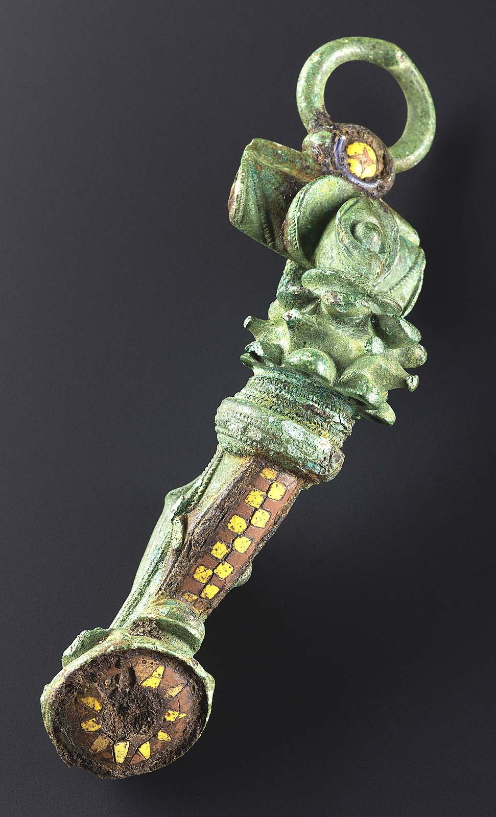 Curator Susanne Ebbinghaus writes in “Celtic Art and Its Interpretations,” her outstanding and very readable catalog essay, “Representations of the human figure, especially on a monumental scale, are rare throughout [Celtic arts]. Instead, Celtic ornaments tend to play out on jewelry and on elaborate — partly ceremonial — versions of objects with a practical function, such as arms and armor, horse trappings, chariot components and feasting equipment crafted out of metal and other materials.”