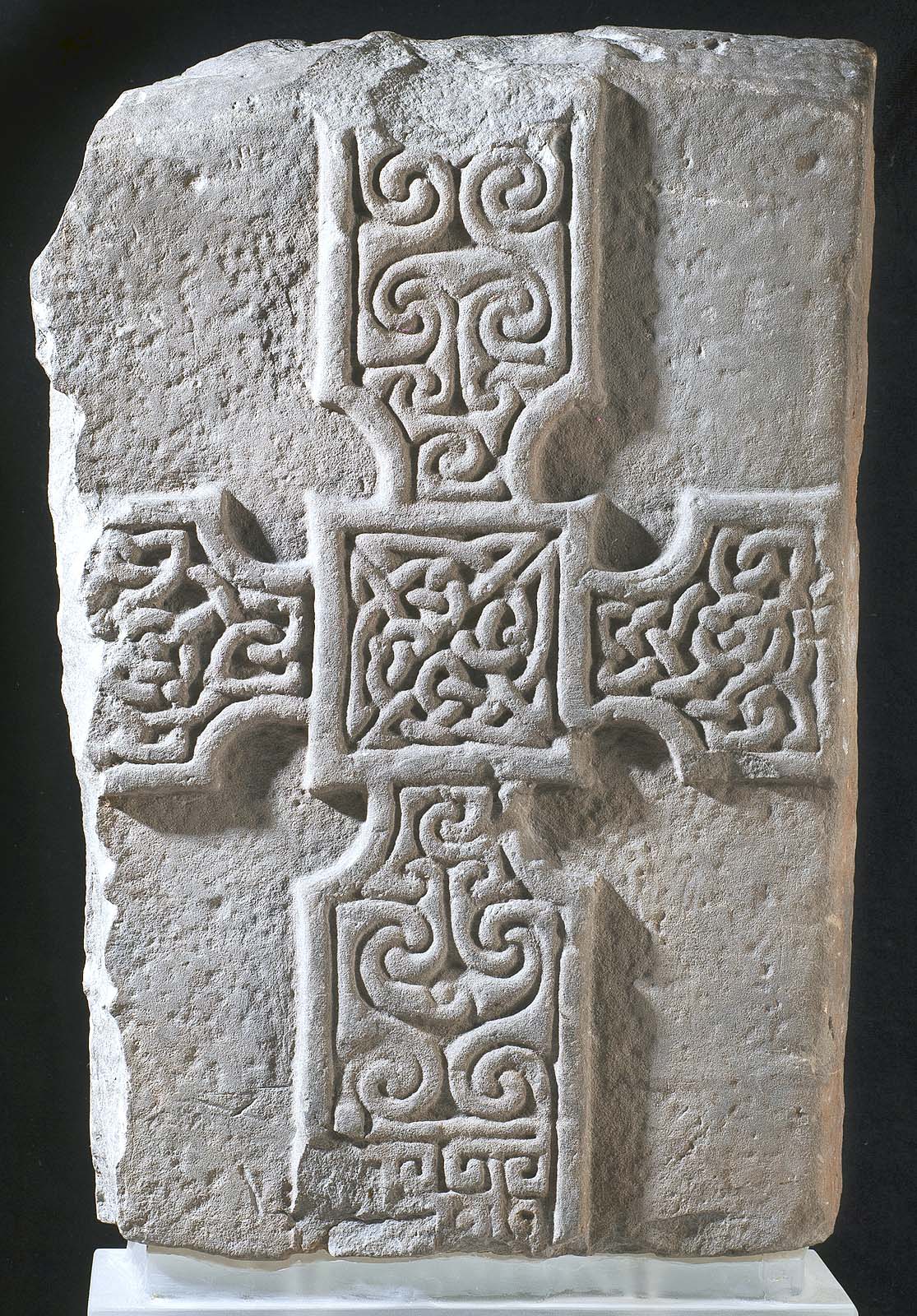 Cross slab, Eighth Century CE, gray sandstone, 44 centimeters tall, from Monifieth, Angus, Scotland. National Museums Scotland, Edinburgh, X.IB 27. © National Museums Scotland.