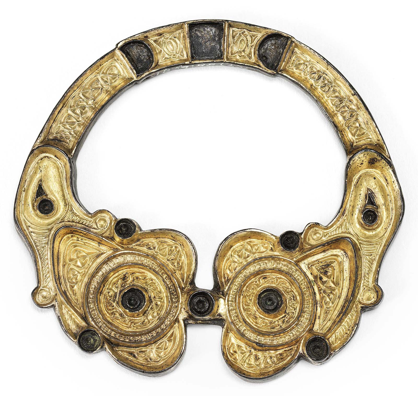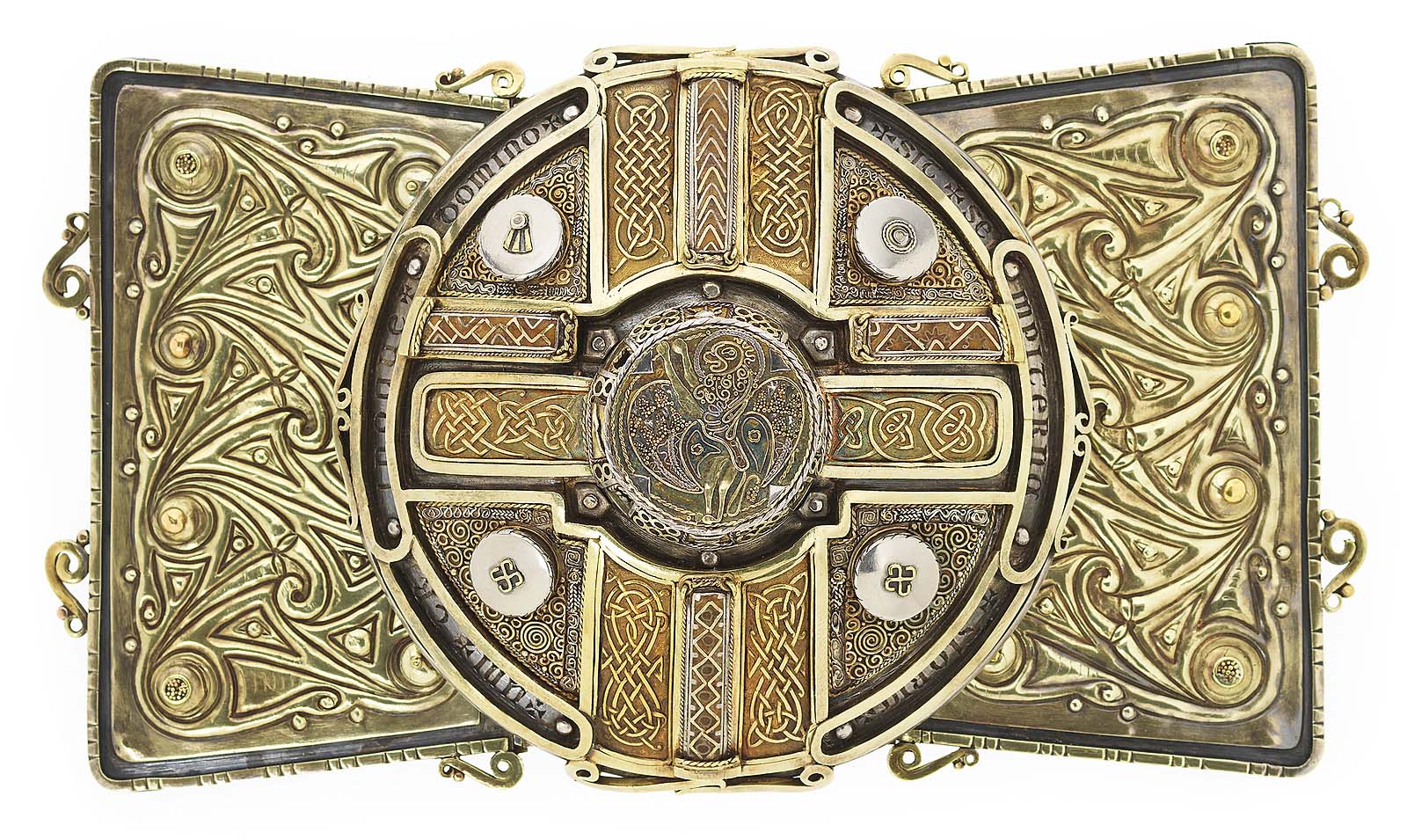 In fact, it’s hard to avoid words like “cosmic” when you take in the images on these pages. Every form you look at seems to be in a constant state of metamorphosis from the vegetative and geometric to the animal and mythical and back: vine becoming neck, triangle becoming beak, gemstone becoming eye. Even the bronze Third Century BCE pony cap, excavated in Scotland, which seems to be a kind of fanciful, even fun adornment, a helmet Loki lost when he was trying to conquer Earth in The Avengers, begins to swirl and transform as you look at it. The horns taper to dragon heads, the curled vines resolve into elegant, forked tails, something like the tails of whales and the metal straps that bind the horns to the helmet assume the aspect of fish swimming up alongside the bodies of the horns that have become dragons in a zoomorphic design.