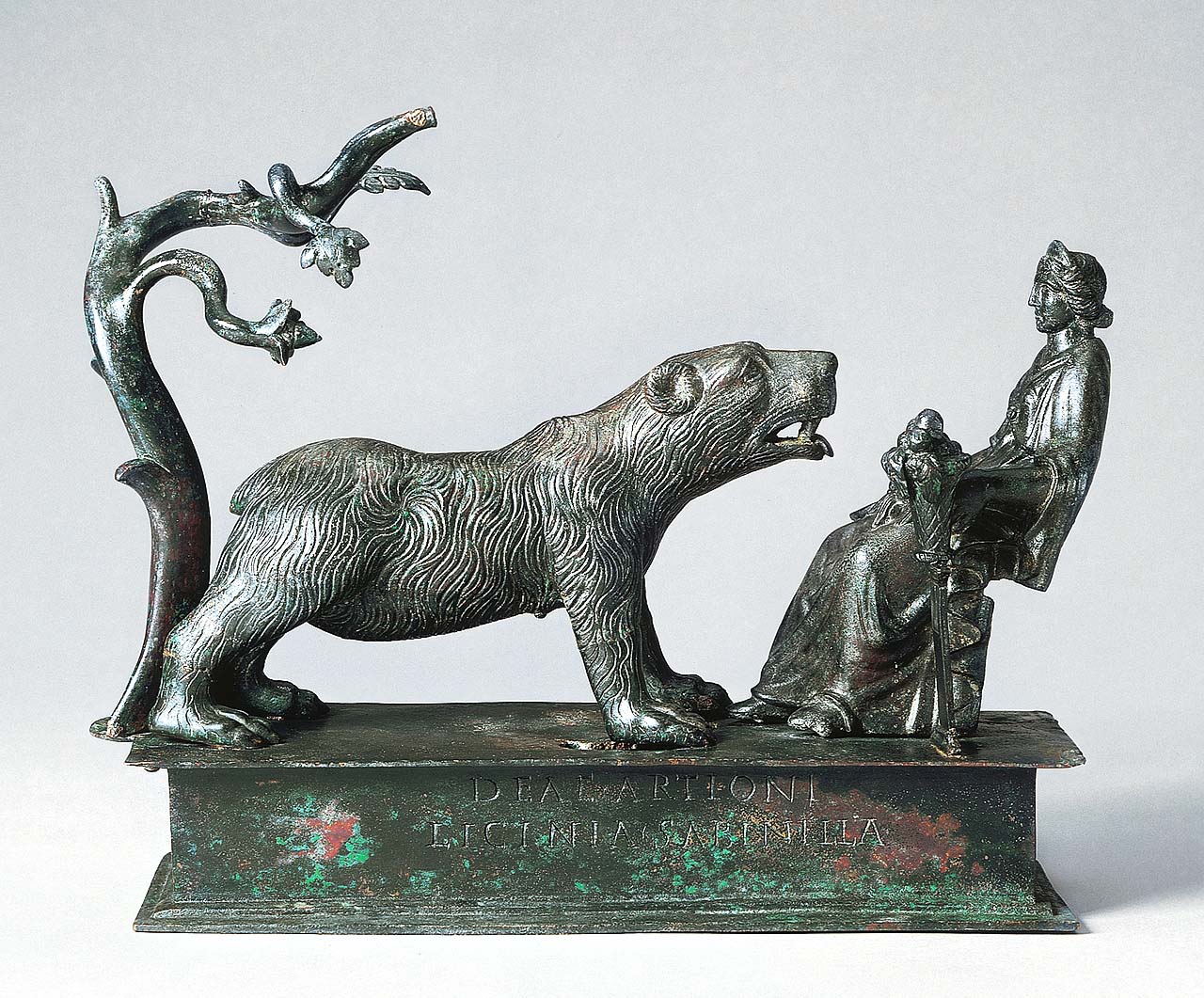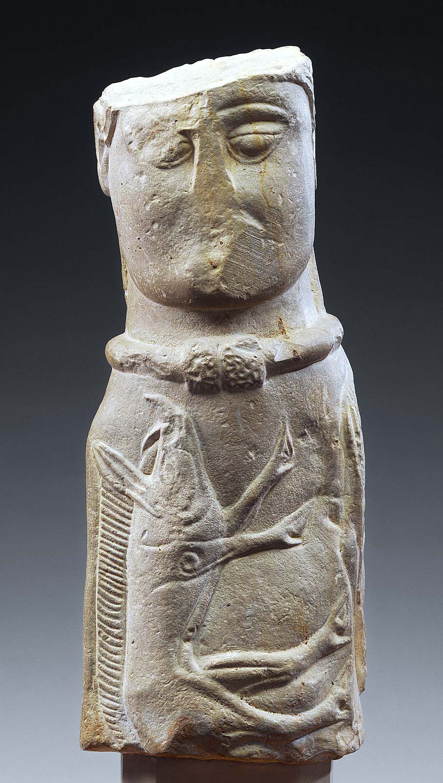 Sculpture depicting a male figure wearing a torque and bearing images of wild animals, First Century BCE, limestone, 30 centimeters tall, from Euffigneix, Haute-Marne, France. Musée d’Archéologie nationale, Saint-Germain-en-Laye, 78243. © RMN-Grand Palais/Art Resource, NY.
