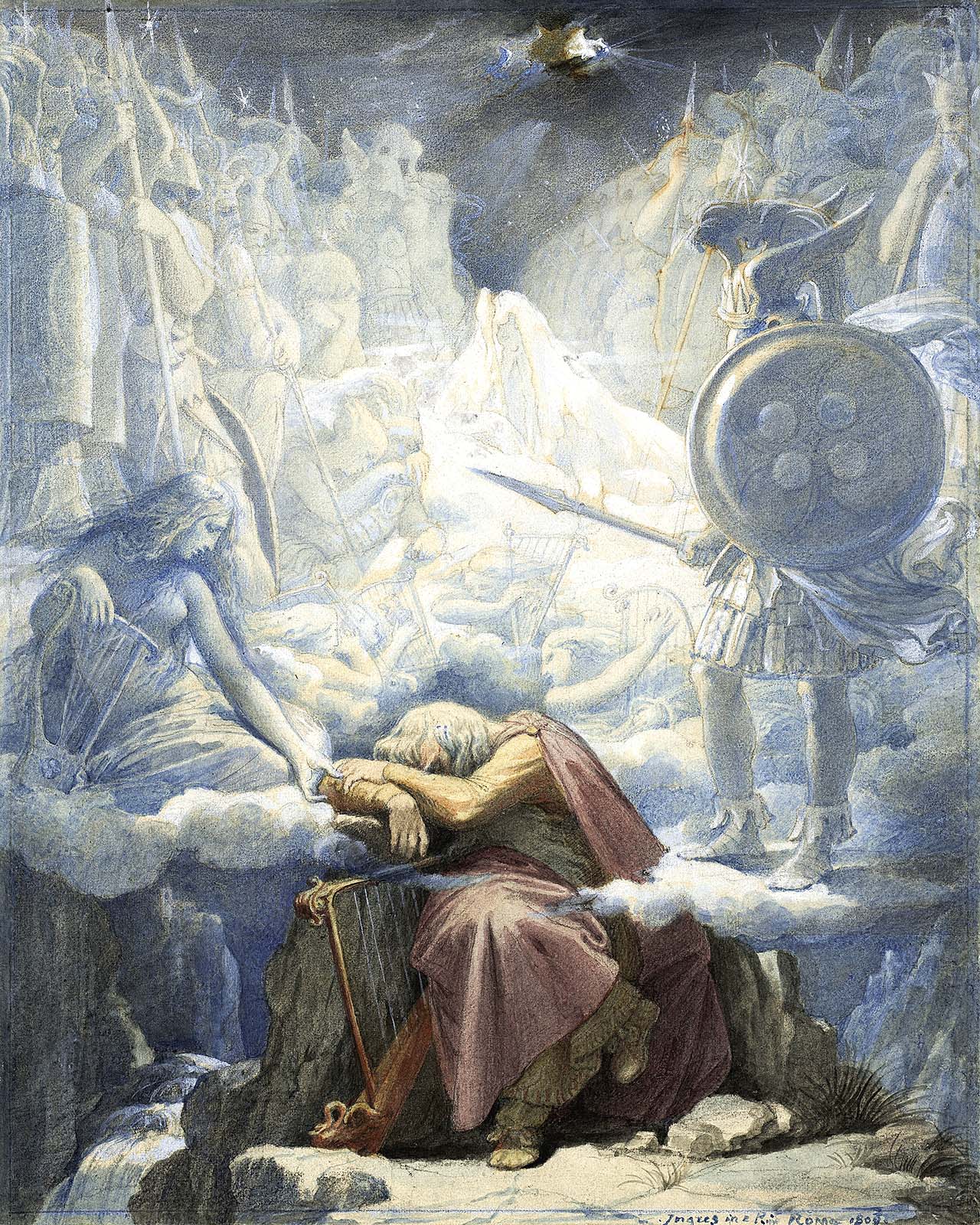 “The Dream of Ossian” by Jean-Auguste-Dominique Ingres, circa 1832-34, watercolor, white gouache and brown ink over graphite and partial stylus outlining on white wove paper, 9¾ by 7⅜ inches. Harvard Art Museums/Fogg Museum, bequest of Grenville L. Winthrop, 1943.376. © President and Fellows of Harvard College.
