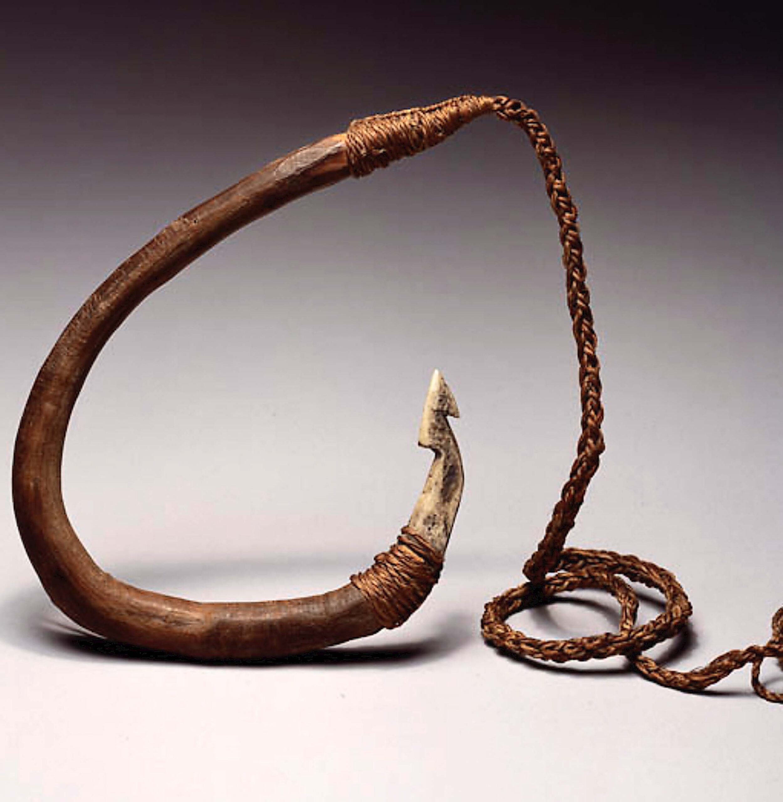 Fishhook by a Māori artist in Aotearoa (New Zealand), early 1800, flax, wood, and bone. Gift of Daniel Ward, 1802. E5629. Peabody Essex Museum.