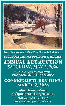 HISTORIC AMERICAN ARTISTS -HIGHLIGHTING CAPE ANN SCHOOL Featured Consignment in 2025: Winter, Vermont by Emile Gruppe CONSIGNMENT DEADLINE: MARCH 7, 2026 More Information: rockportartassn.org/auction 978-546-6604, ext. 1002 [email protected]