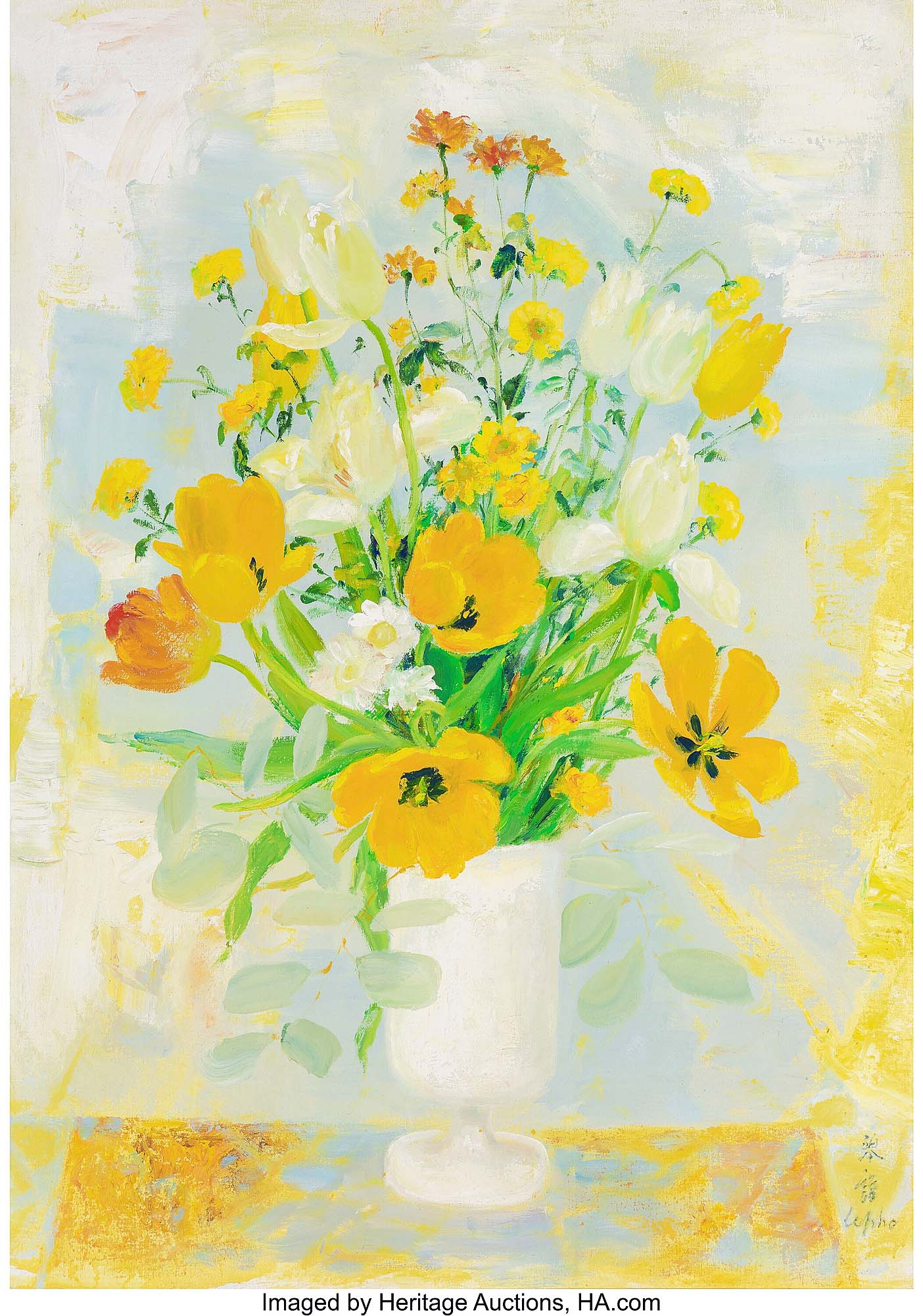 Le Pho’s (French/Vietnamese, 1907-2001) “Fleurs,” 1972, oil on canvas, 46 by 32¼ inches, bloomed to the sale-high price of $137,500 ($50/60,000).