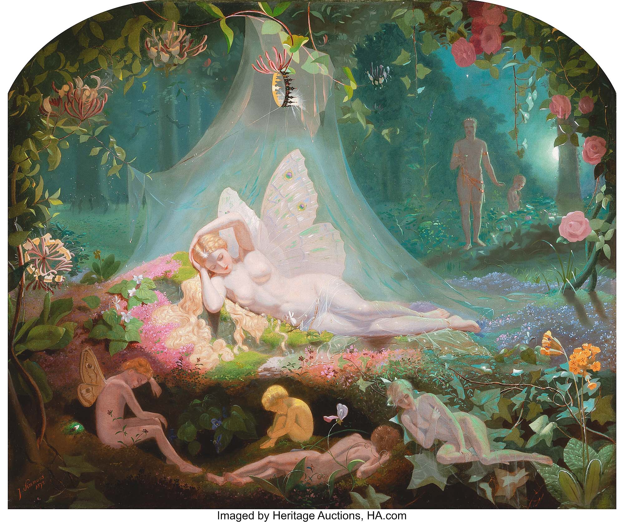 Inspired by Shakespeare, John Simmons (British, 1823-1876) painted “There sleeps Titania” in 1872. The 25-by-30-inch oil on canvas awoke bidders for $47,500 ($20/30,000).