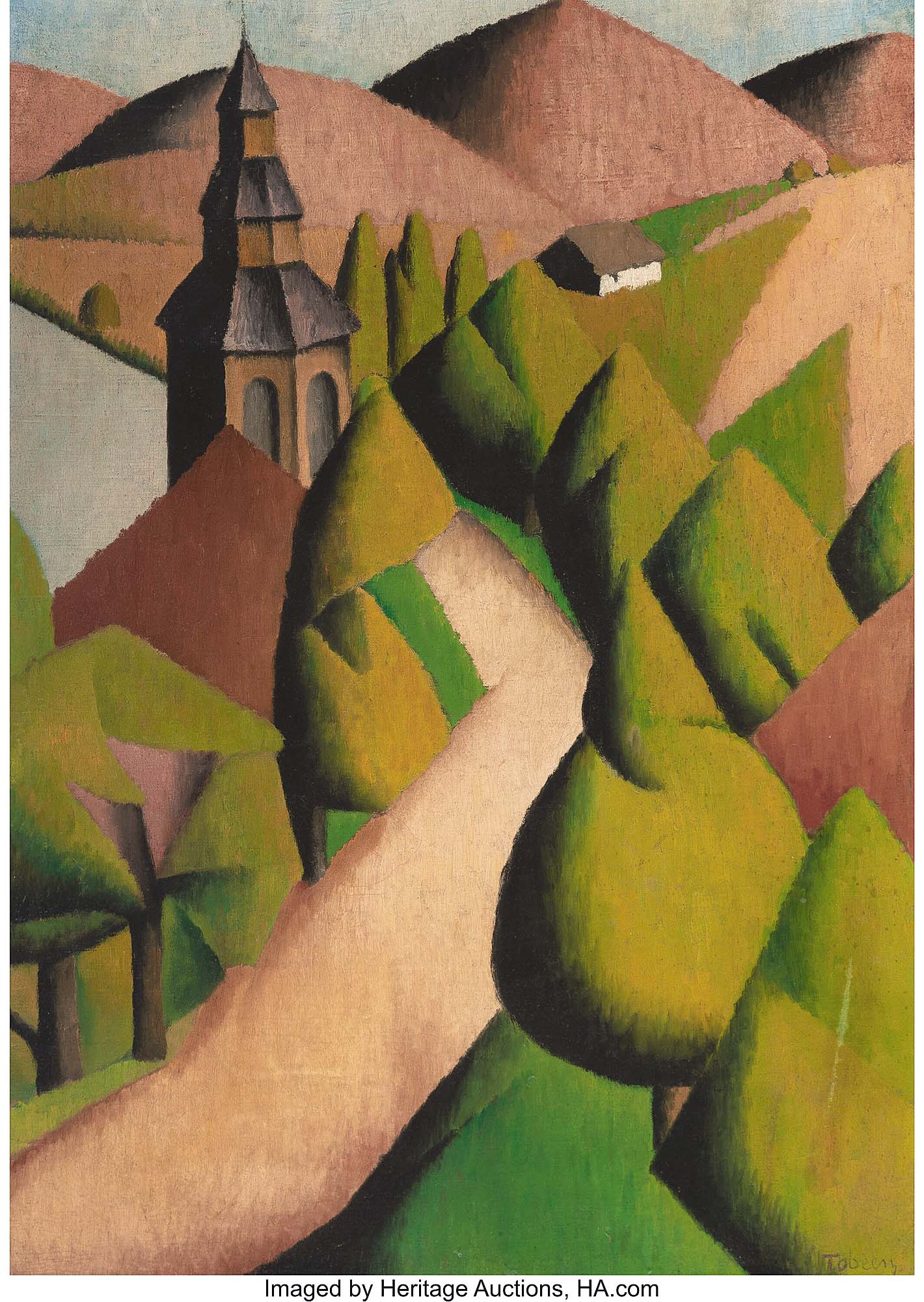“Paysage de Ciboure avec le chemin du vieux cimetière et le clocher” by Tobeen (Félix Bonnet) (French, 1880-1938), circa 1916-20, oil on canvas, 250190 by 18¼ inches, was taken to $40,000 ($12/18,000).
