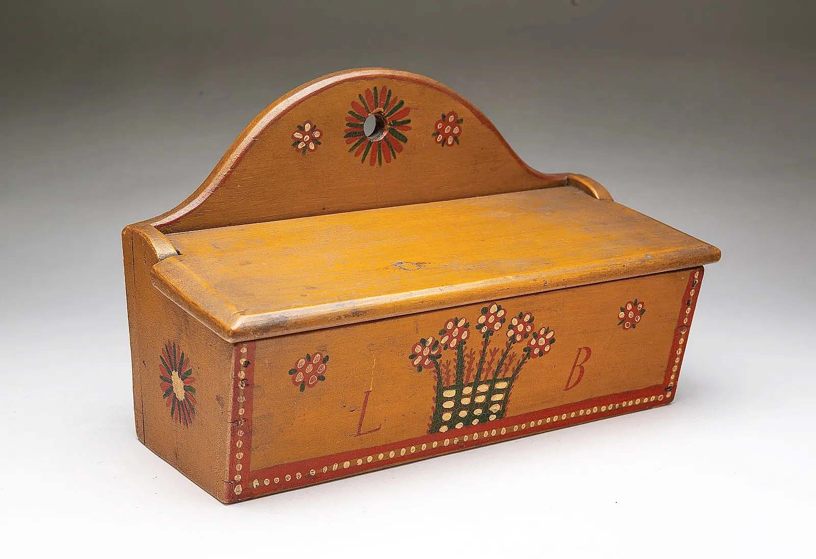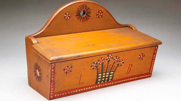 COLUMBUS, OHIO — Elegantly simple and with good provenance were the keys to the Pennsylvania folk art paint-decorated wall box that achieved top-lot status at Amelia Jeffers’ March Great Estates Auction, March 19-20. Selling early on during the first day’s session, the late Nineteenth-early Twentieth Century box achieved $17,200, including buyer’s premium ($300/600). The box, retaining its original mustard-yellow paint with green, red and white floral decoration, had formerly passed through the hands of Maine antiques dealers Jim and Nancy Glazer. A complete report on this auction will appear in an upcoming edition.