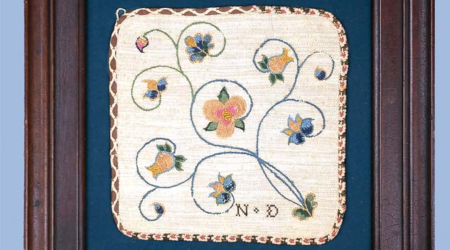 This crewelwork potholder, circa 1770, was offered by Curious Works Antiques, Greenville, S.C.