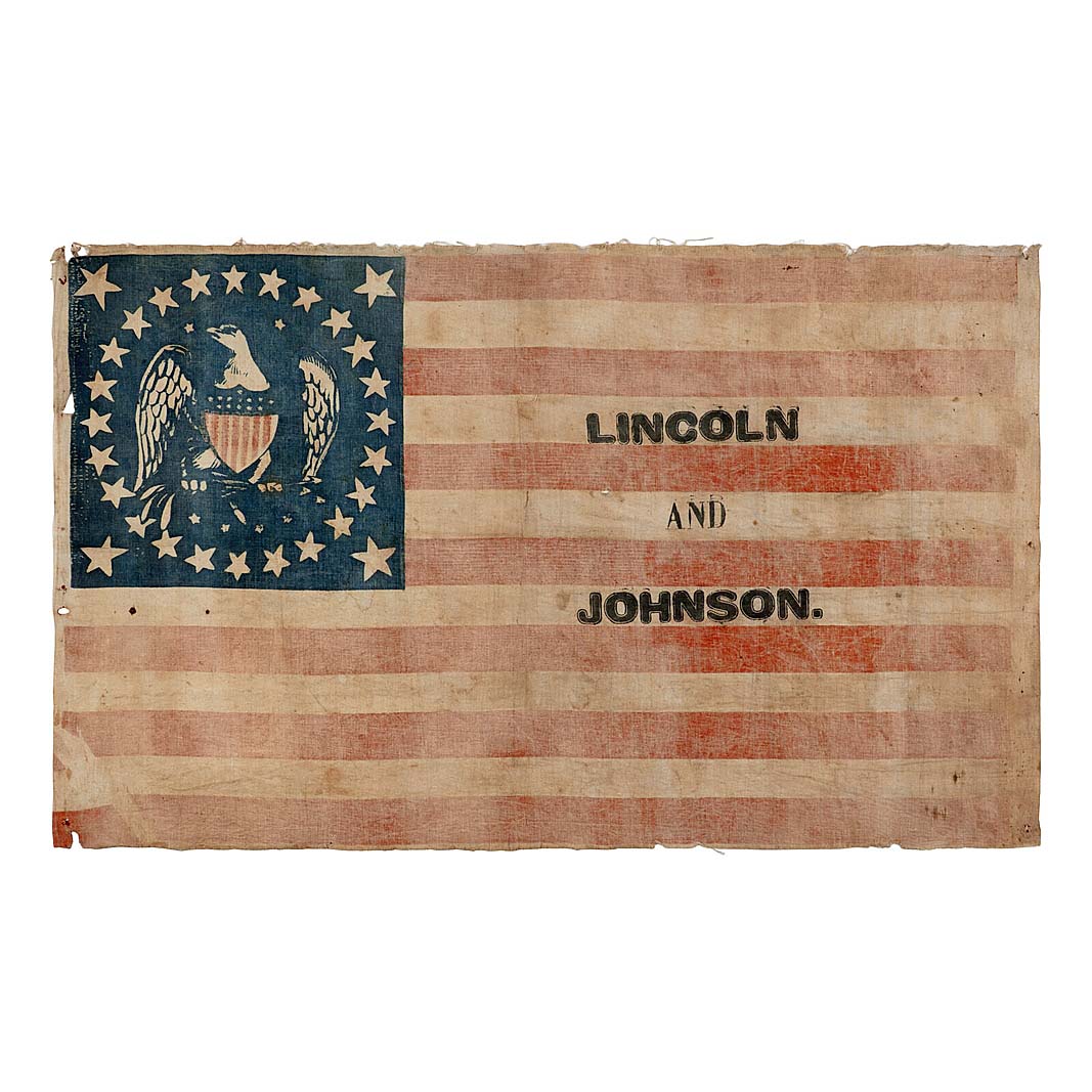 Achieving a new auction record, this 34-star eagle parade flag from the 1864 Lincoln-Johnson campaign, circa 1863-64, paint-printed on cotton, 25¾ by 16½ inches, sold to Jeff R. Bridgman for $281,600, the sale’s highest price ($50/100,000).