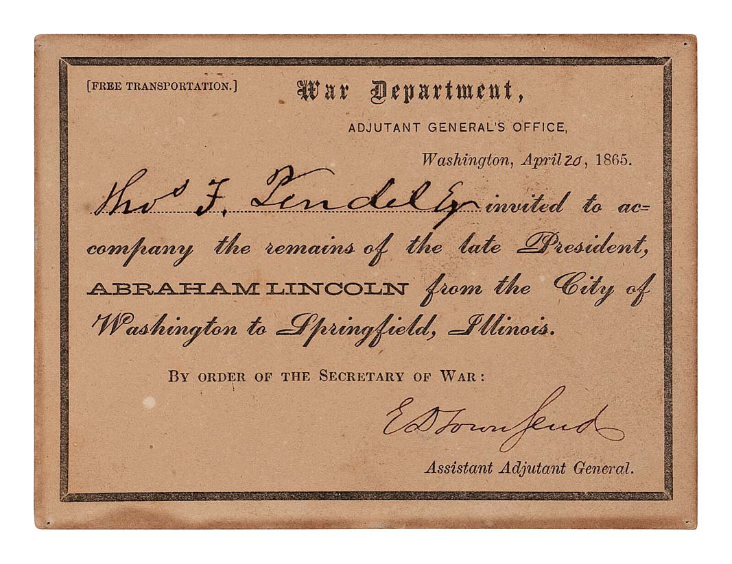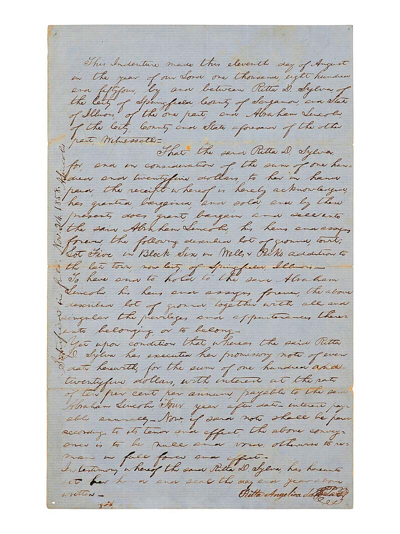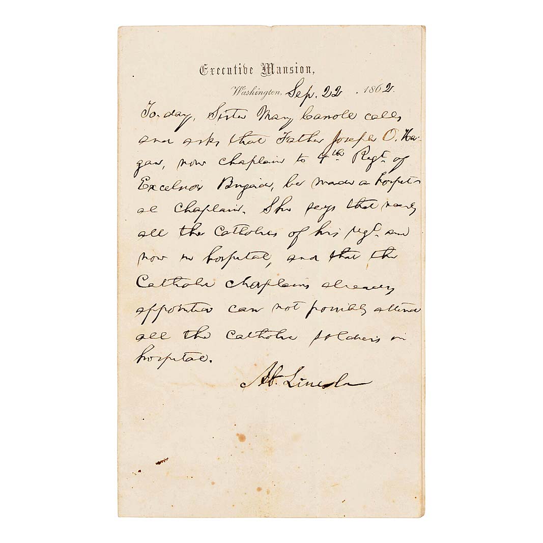 A few autographed Lincoln documents also drew bidder attention, including an unpublished memorandum on Executive Mansion stationary dated from Washington, DC, on September 22, 1862 ($38,400); a document concerning a loan dated to Springfield, Ill., on August 11, 1854 ($17,920); a legal document from the case of Mary Fahnestock dated to Springfield, Ill., on July 20, 1857 ($17,920) and a legal document concerning Columbus Machine Manufacturing Co. et al. v. E.R. Ulrich et al., which was dated to Springfield, Ill., on February 13, 1860 ($16,640).